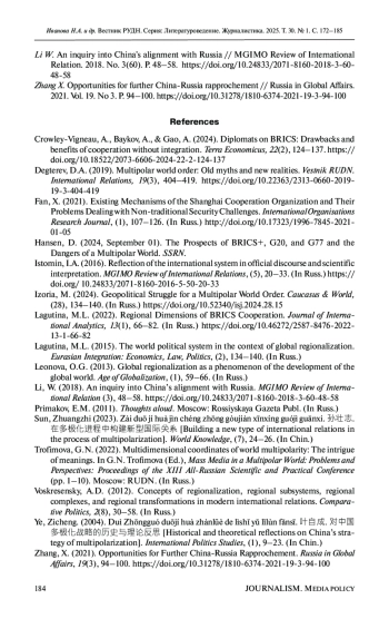 8. Сунь Чжуанчжи. Цзай доцзихуа цзиньчэн чжун гоуцзянь синьсин гоцзи гуаньси. 孙壮志. 在多极化进程中构建新型国际关系 [Построение международных отношений нового типа в процессе многополяризации] // Мировые знания. 2023. № 7. С. 24-26.