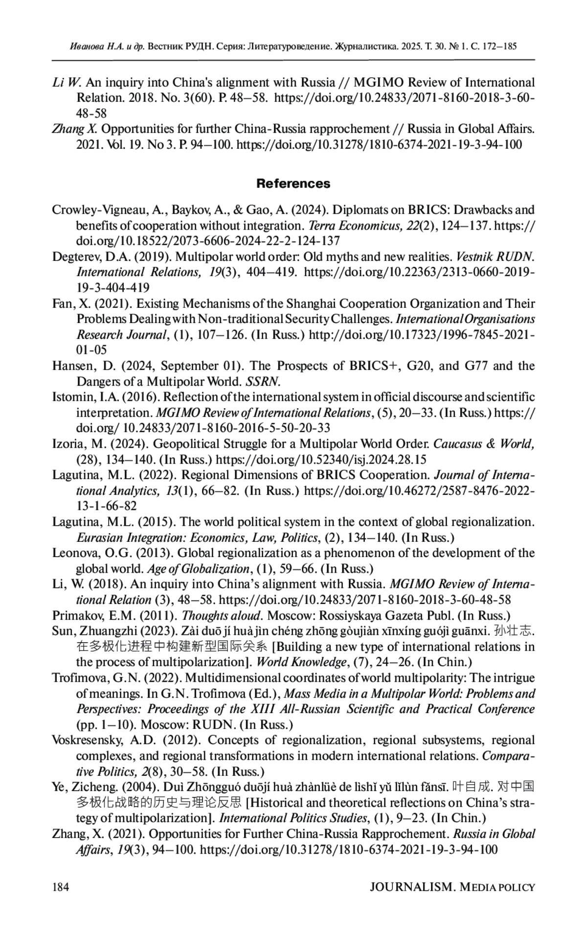 12. Crowley-Vigneau A., Baykov A., Gao A. Diplomats on BRICS: Drawbacks and benefits of cooperation without integration // Terra Economicus. 2024. Vol. 22. No. 2. P. 124-137. DOI: 10.18522/2073-6606-2024-22-2-124-137 EDN: DXLMQN