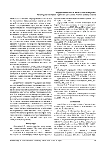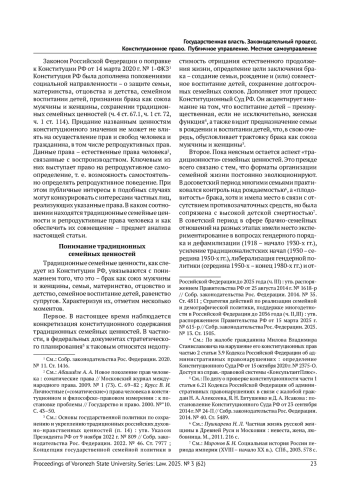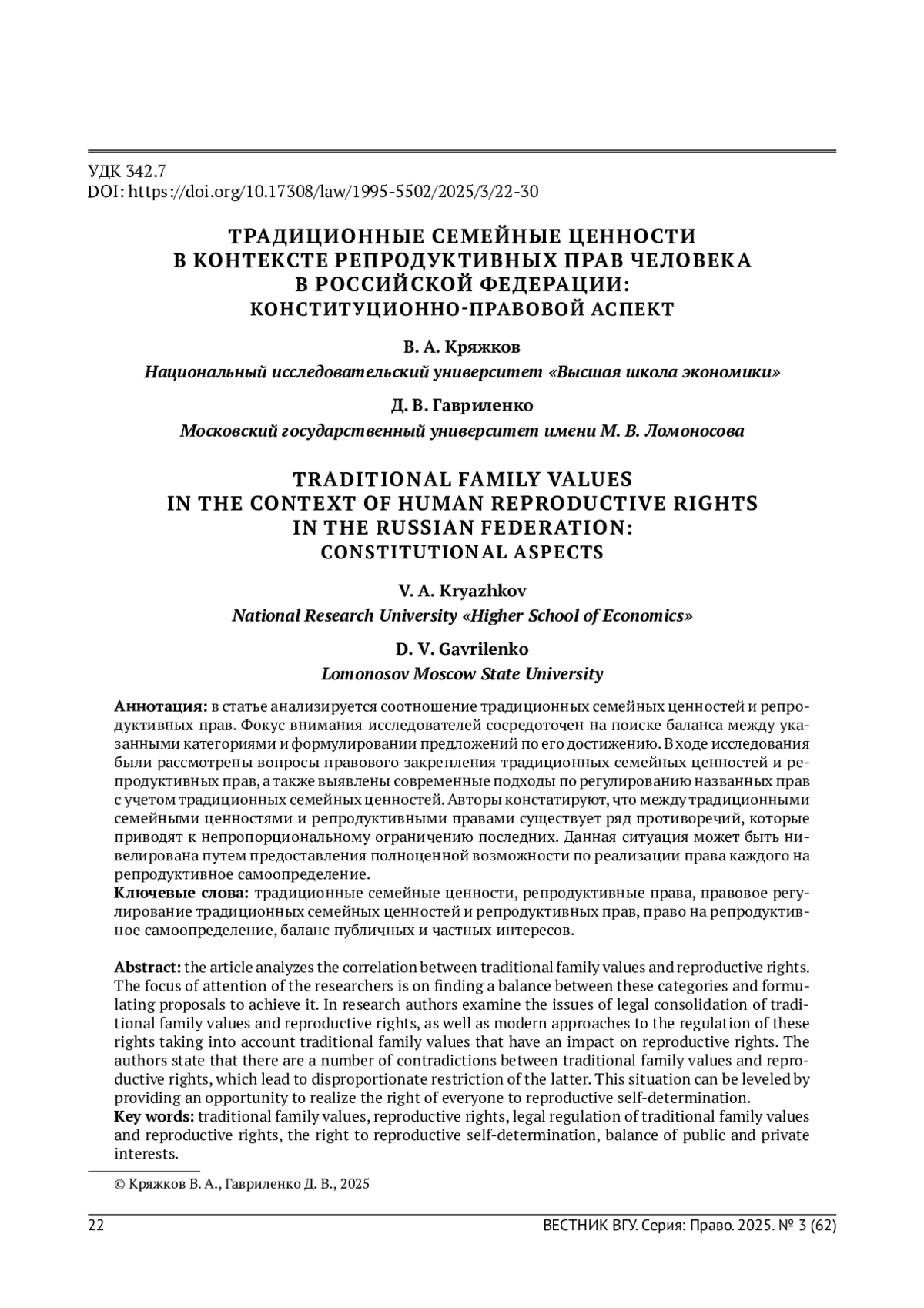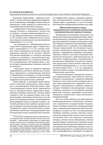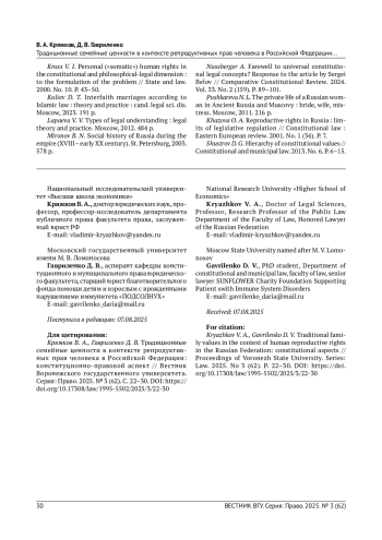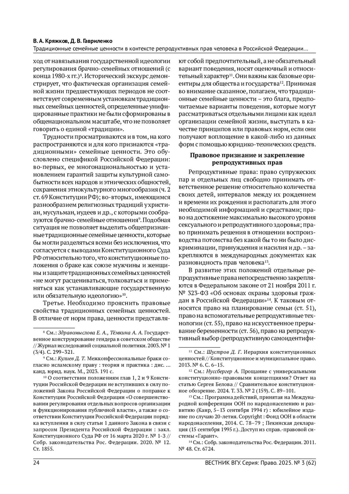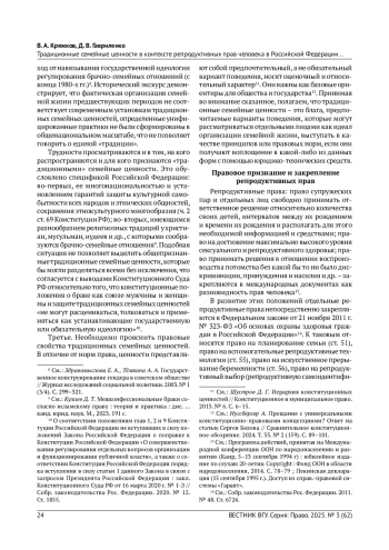 КРЯЖКОВ В.А., ГАВРИЛЕНКО Д.В. ТРАДИЦИОННЫЕ СЕМЕЙНЫЕ ЦЕННОСТИ В КОНТЕКСТЕ РЕПРОДУКТИВНЫХ ПРАВ ЧЕЛОВЕКА В РОССИЙСКОЙ ФЕДЕРАЦИИ: КОНСТИТУЦИОННО-ПРАВОВОЙ АСПЕКТ // ВЕСТНИК ВОРОНЕЖСКОГО ГОСУДАРСТВЕННОГО УНИВЕРСИТЕТА. СЕРИЯ: ПРАВО. 2025. № 3 (62)