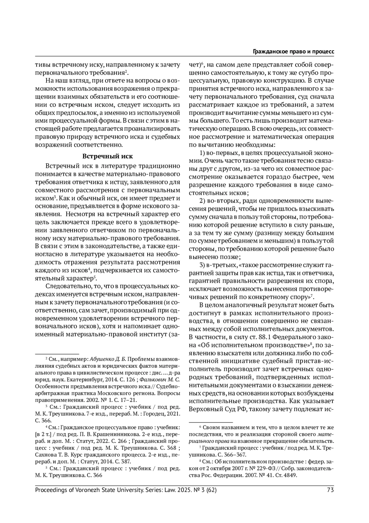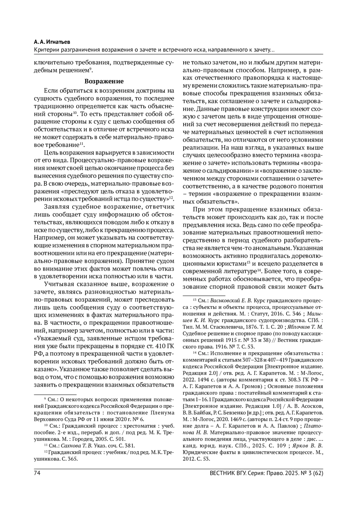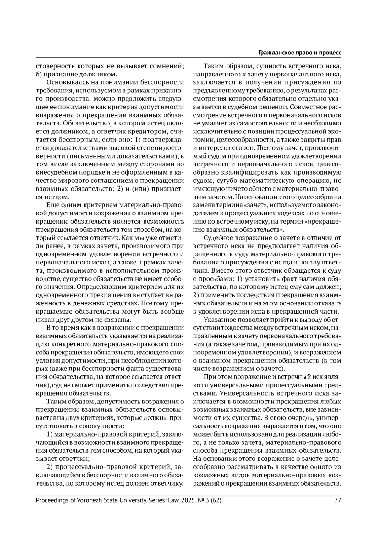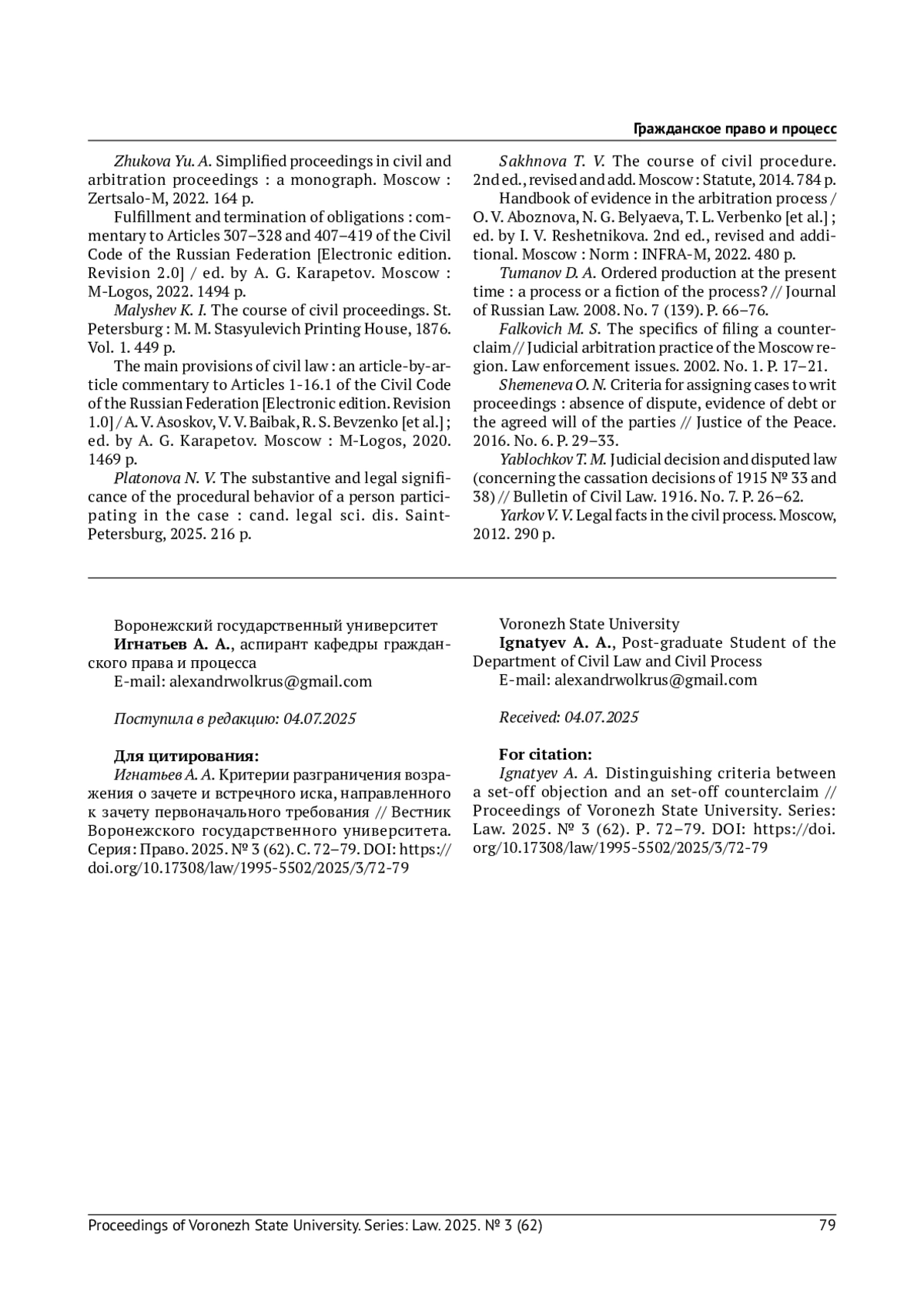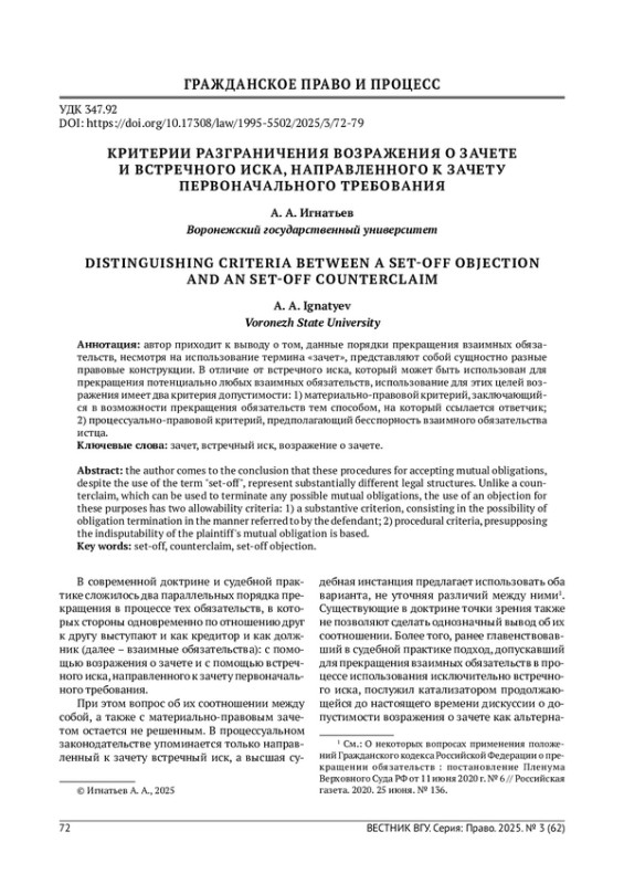 ИГНАТЬЕВ А.А. КРИТЕРИИ РАЗГРАНИЧЕНИЯ ВОЗРАЖЕНИЯ О ЗАЧЕТЕ И ВСТРЕЧНОГО ИСКА, НАПРАВЛЕННОГО К ЗАЧЕТУ ПЕРВОНАЧАЛЬНОГО ТРЕБОВАНИЯ // ВЕСТНИК ВОРОНЕЖСКОГО ГОСУДАРСТВЕННОГО УНИВЕРСИТЕТА. СЕРИЯ: ПРАВО. 2025. № 3 (62)