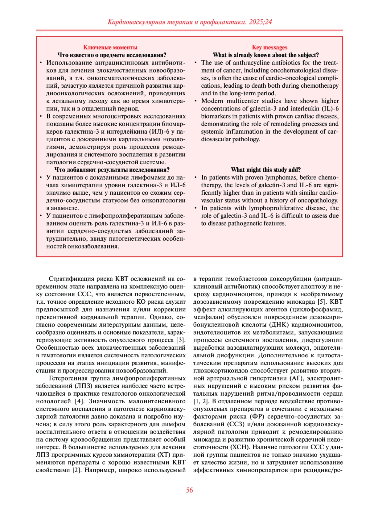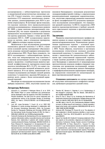 Заключение. В ходе исследования было показано, что исследуемые группы по уровню потенциально проатерогенных липидов статистически значимо не различались. Результаты сравнительного анализа демонстрируют, что концентрация галектина-3 и ИЛ-6 при ЛПЗ значимо выше относительно данных группы сравнения, их высокий уровень может являться отражением активности опухолевого процесса. Значение данных биомаркеров в развитии кардиоваскулотоксических осложнений у пациентов с ЛПЗ на данный момент не изучено и представляется интересным с точки зрения их возможной предикторной роли в развитии сердечно-сосудистых осложнений химиотерапии.