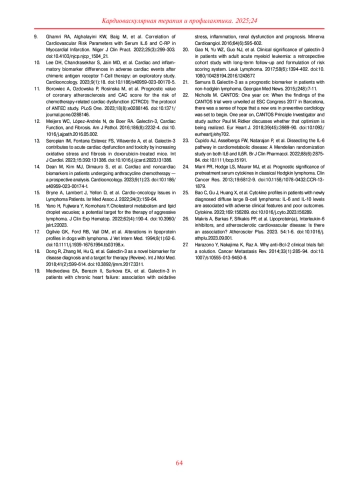 8. Васюк Ю. А., Гендлин Г. Е., Емелина Е. И. и др. Согласованное мнение российских экспертов по профилактике, диагностике и лечению сердечно-сосудистой токсичности противоопухолевой терапии. Российский кардиологический журнал. 2021;26(9):4703. DOI: 10.15829/1560-4071-2021-4703