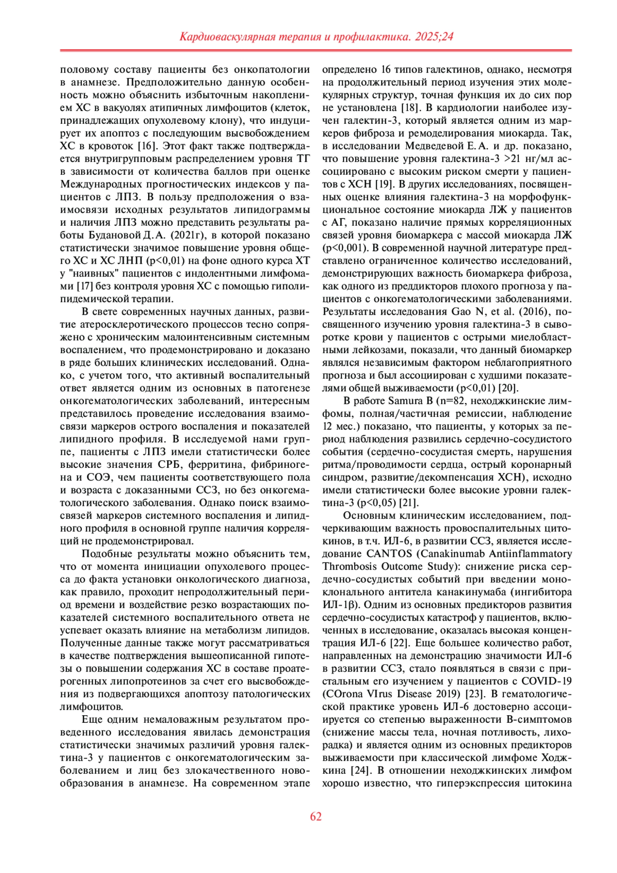 Результаты. Включенные в исследование пациенты обеих групп были сопоставимы по возрасту, полу, факторам риска сердечно-сосудистого заболеваний, кардиальной терапии. Определено, что у пациентов основной группы уровень потенциально проатерогенных липидов в группе пациентов с лимфомами был несколько выше, чем в группе сравнения, хотя различия не достигли статистической значимости (p>0,05); достоверно выше были — уровни белков острой фазы (С-реактивный белок, ферритин, фибриноген), скорость оседания эритроцитов (р<0,05 для всех показателей), ИЛ-6 (p=0,032), маркера фиброза — галектина-3 (p=0,001). Внутригрупповой анализ в группе ЛПЗ в зависимости от международных прогностических индексов для лимфом (IPI/MIPI/FLIPI — International Prognostic Index/Mantle cell Lymphoma International Prognostic Index/Follicular Lymphoma International Prognostic Index) продемонстрировал, что уровни галектина-3 и ИЛ-6 оказались выше у пациентов с худшими показателями прогноза ЛПЗ. В ходе корреляционного анализа выявлена прямая умеренной силы взаимосвязь между галектином-3 и ИЛ-6 (r=0,488; p=0,016).