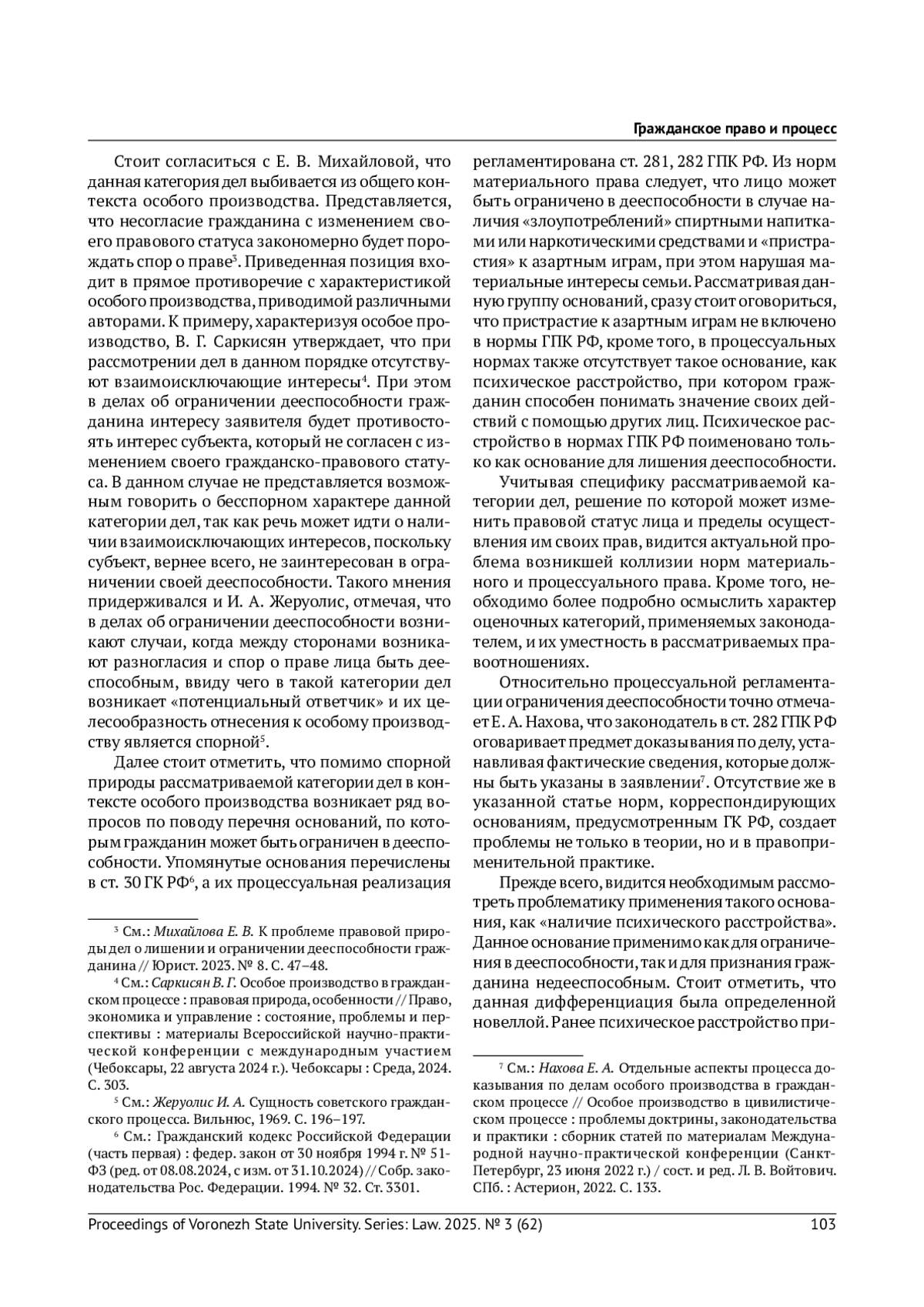6. Михайлова Е. В. К проблеме правовой природы дел о лишении и ограничении дееспособности гражданина // Юрист. 2023. № 8. С. 45-50.