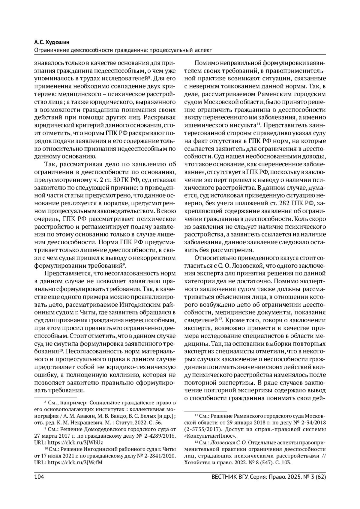 5. Лозовская С. О. Отдельные аспекты правоприменительной практики ограничения дееспособности лиц, страдающих психическими расстройствами // Хозяйство и право. 2022. № 8 (547). С. 98-108. EDN: EQAIAH