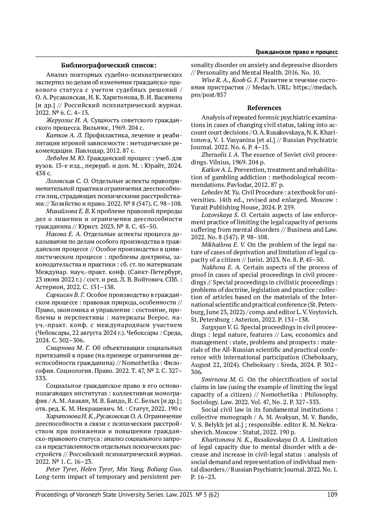 11. Харитонова Н.К.,Русаковская О. А. Ограничение дееспособности в связи с психическим расстройством при понижении и повышении гражданско-правового статуса: анализ социального запроса и представленности отдельных психических расстройств // Российский психиатрический журнал. 2022. № 1. С. 16-23. EDN: UZWUXV