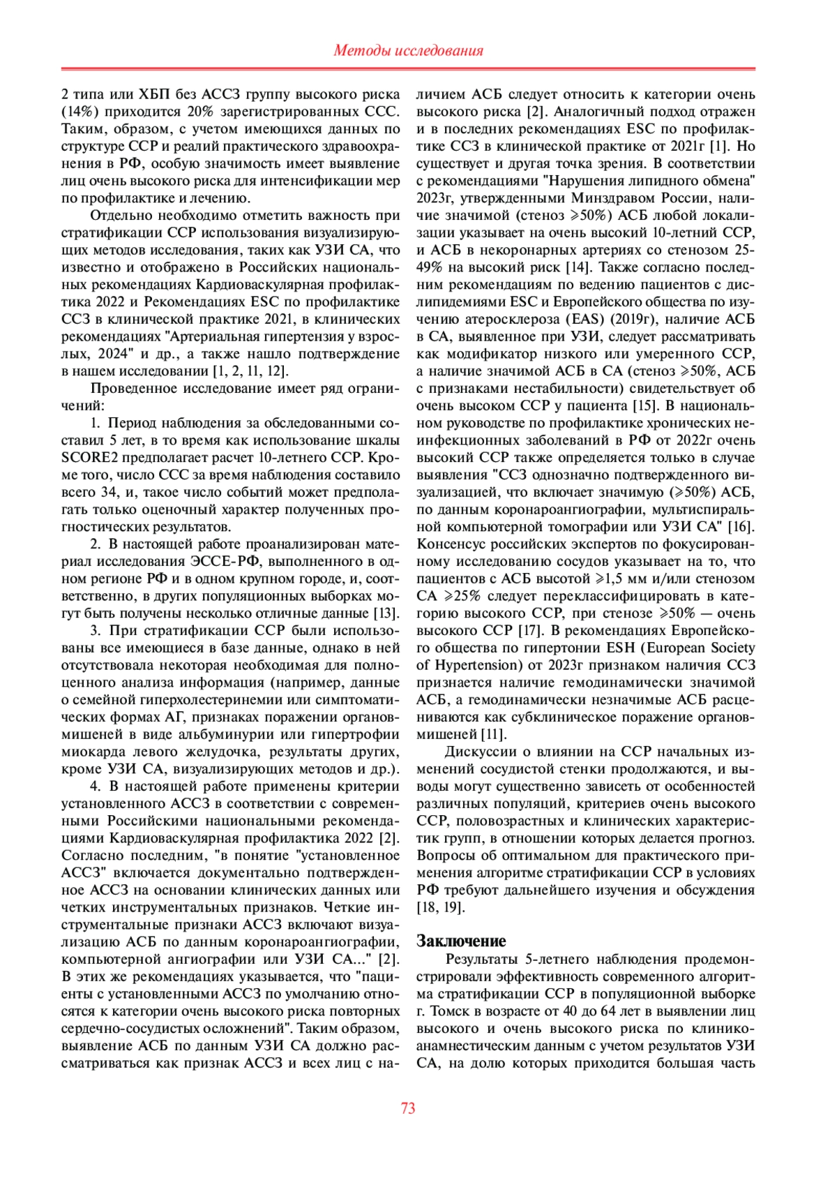 Заключение. Результаты 5-летнего наблюдения продемонстрировали эффективность современного алгоритма стратификации ССР в популяционной выборке г. Томск в возрасте от 40 до 64 лет в выявлении лиц высокого и очень высокого риска по клинико-анамнестическим данным с учетом результатов УЗИ СА, на долю которых приходится бóльшая часть (88%) ССС (смерть от ССЗ, нефатальный ИМ, инсульт). Шкала SCORE2 определила высокий и очень высокий риск у 98% относительно здоровых лиц, в то время как частота ССС у них составила всего 1% за 5 лет наблюдения, что не подтверждает эффективность и целесообразность применения шкалы SCORE2 при стратификации ССР.