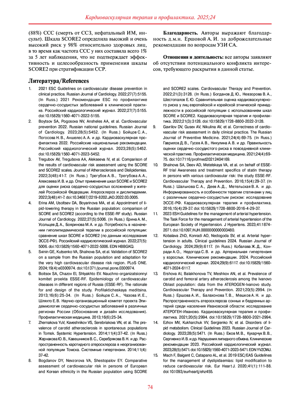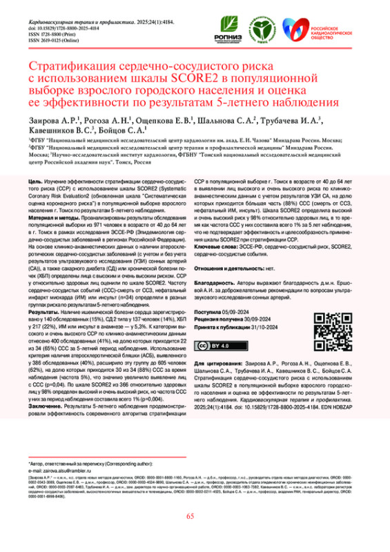 ЗАИРОВА А. Р., РОГОЗА А. Н., ОЩЕПКОВА Е. В., ШАЛЬНОВА С. А., ТРУБАЧЕВА И. А., КАВЕШНИКОВ В. С., БОЙЦОВ С. А. СТРАТИФИКАЦИЯ СЕРДЕЧНО-СОСУДИСТОГО РИСКА С ИСПОЛЬЗОВАНИЕМ ШКАЛЫ SCORE2 В ПОПУЛЯЦИОННОЙ ВЫБОРКЕ ВЗРОСЛОГО ГОРОДСКОГО НАСЕЛЕНИЯ И ОЦЕНКА ЕЕ ЭФФЕКТИВНОСТИ ПО РЕЗУЛЬТАТАМ 5-ЛЕТНЕГО НАБЛЮДЕНИЯ // КАРДИОВАСКУЛЯРНАЯ ТЕРАПИЯ И ПРОФИЛАКТИКА. 2025. № 1, ТОМ 24