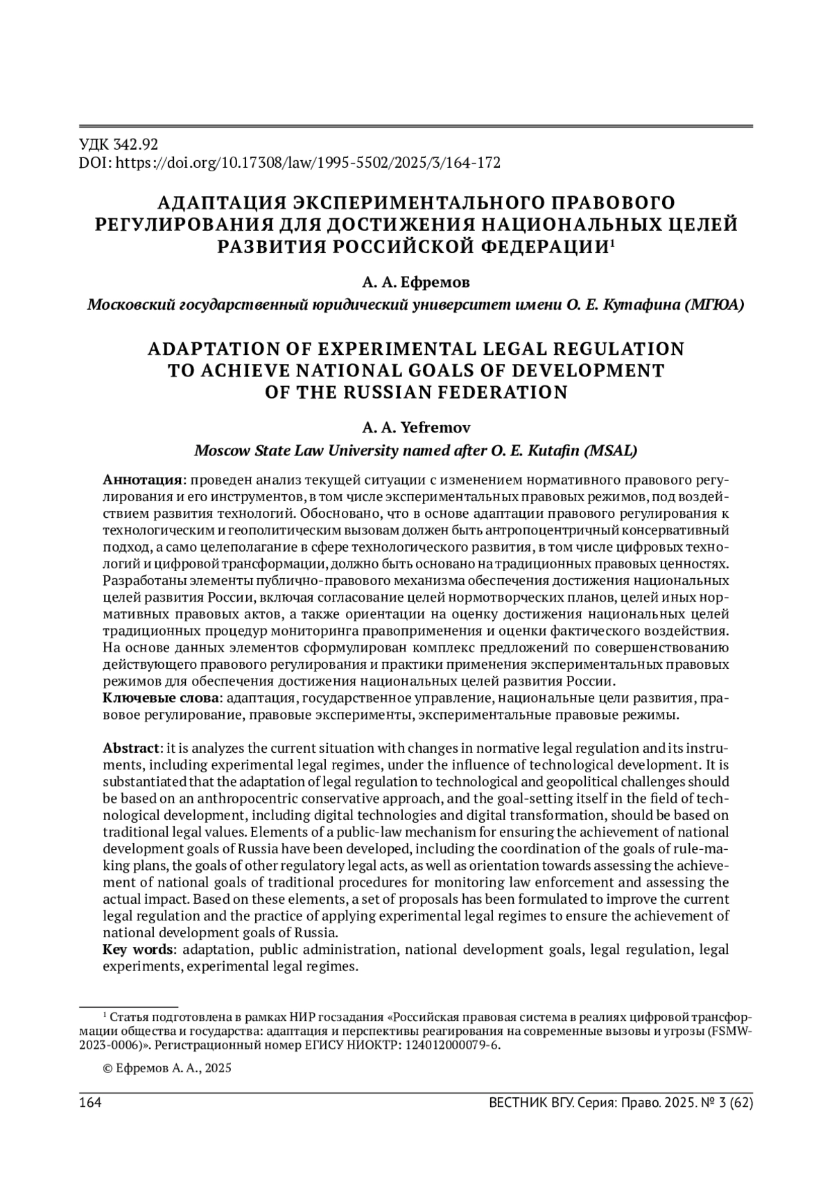 Проведен анализ текущей ситуации с изменением нормативного правового регулирования и его инструментов, в том числе экспериментальных правовых режимов, под воздействием развития технологий. Обосновано, что в основе адаптации правового регулирования к технологическим и геополитическим вызовам должен быть антропоцентричный консервативный подход, а само целеполагание в сфере технологического развития, в том числе цифровых технологий и цифровой трансформации, должно быть основано на традиционных правовых ценностях. Разработаны элементы публично-правового механизма обеспечения достижения национальных целей развития России, включая согласование целей нормотворческих планов, целей иных нормативных правовых актов, а также ориентации на оценку достижения национальных целей традиционных процедур мониторинга правоприменения и оценки фактического воздействия. На основе данных элементов сформулирован комплекс предложений по совершенствованию действующего правового регулирования и практики применения экспериментальных правовых режимов для обеспечения достижения национальных целей развития России.