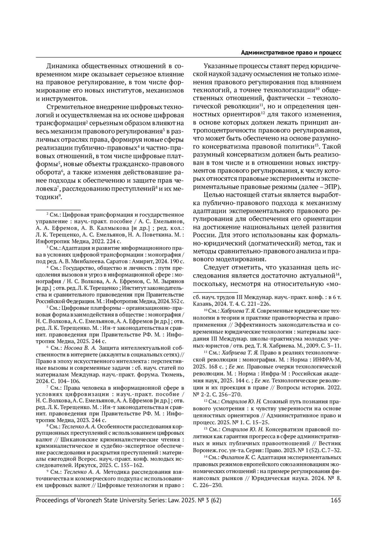 6. Ефремов А. А. Государственный доклад о реализации экспериментальных правовых режимов как инструмент оценки эффективности экспериментального регулирования // Юридическая техника. 2025. № 19. С. 167-169. EDN: ZATWAH