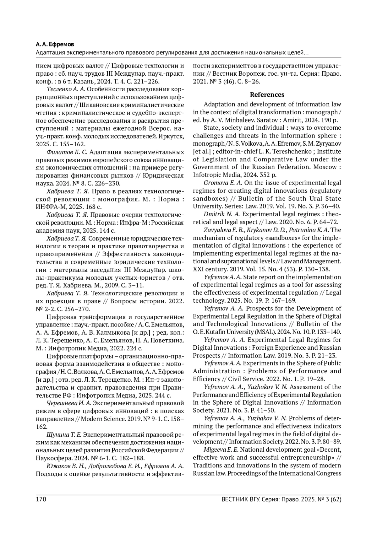 7. Ефремов А. А. Перспективы развития экспериментального правового регулирования в сфере цифровых и технологических инноваций // Вестник Университета имени О. Е. Кутафина (МГЮА).2024. № 10. С. 133-140. EDN: JGXFNY