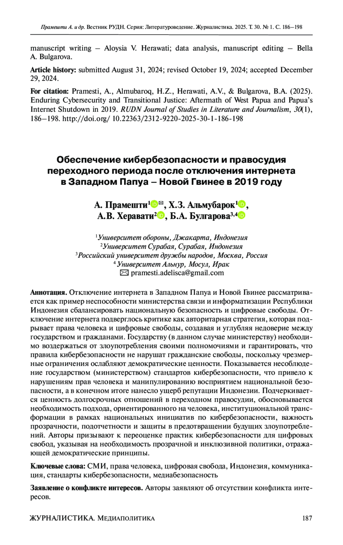 Отключение интернета в Западном Папуа и Новой Гвинее рассматривается как пример неспособности министерства связи и информатизации Республики Индонезия сбалансировать национальную безопасность и цифровые свободы. Отключение интернета подверглось критике как авторитарная стратегия, которая подрывает права человека и цифровые свободы, создавая и углубляя недоверие между государством и гражданами. Государству (в данном случае министерству) необходимо воздержаться от злоупотребления своими полномочиями и гарантировать, что правила кибербезопасности не нарушат гражданские свободы, поскольку чрезмерные ограничения ослабляют демократические ценности. Показывается несоблюдение государством (министерством) стандартов кибербезопасности, что привело к нарушениям прав человека и манипулированию восприятием национальной безопасности, а в конечном итоге нанесло ущерб репутации Индонезии. Подчеркивается ценность долгосрочных отношений в переходном правосудии, обосновывается необходимость подхода, ориентированного на человека, институциональной транс формации в рамках национальных инициатив по кибербезопасности, важность прозрачности, подотчетности и защиты в предотвращении будущих злоупотреблений. Авторы призывают к переоценке практик кибербезопасности для цифровых свобод, указывая на необходимость прозрачной и инклюзивной политики, отражающей демократические принципы.