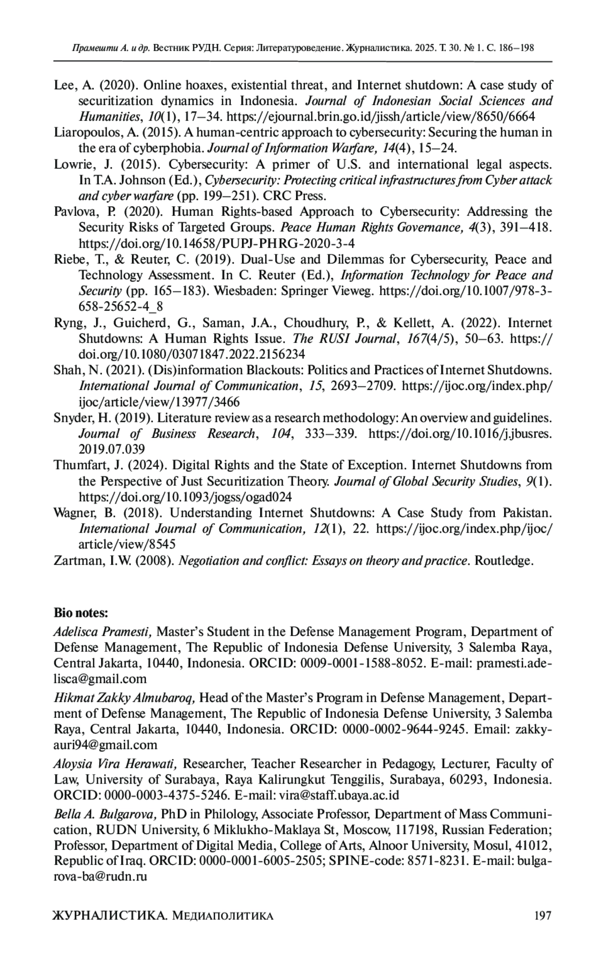 15. Thumfart, J. (2024). Digital Rights and the State of Exception. Internet Shutdowns from the Perspective of Just Securitization Theory. Journal of Global Security Studies, 9(1). DOI: 10.1093/jogss/ogad024 EDN: MFGEBX