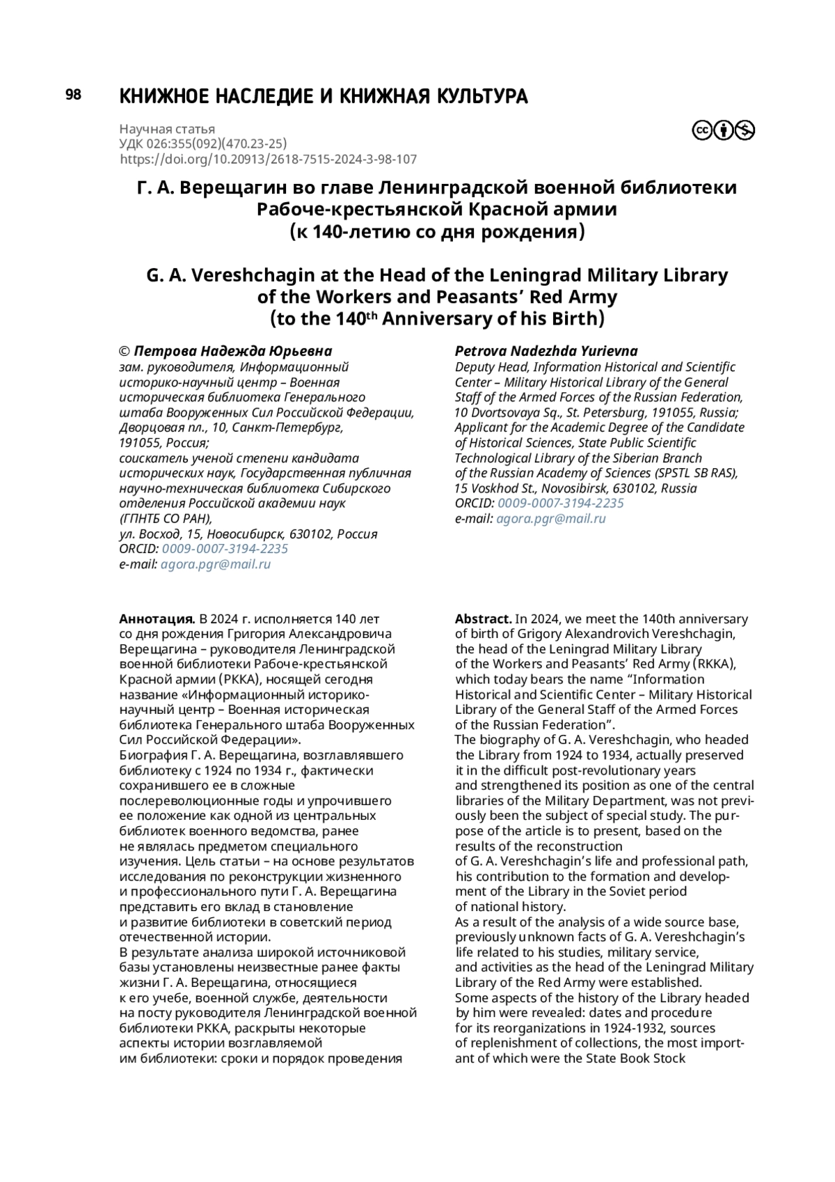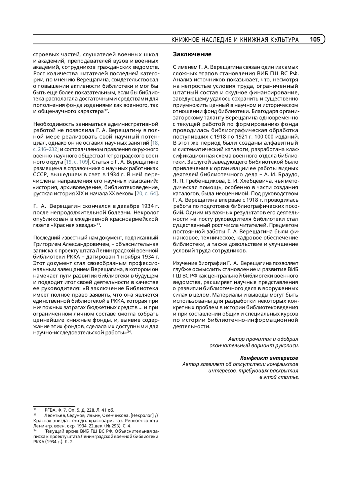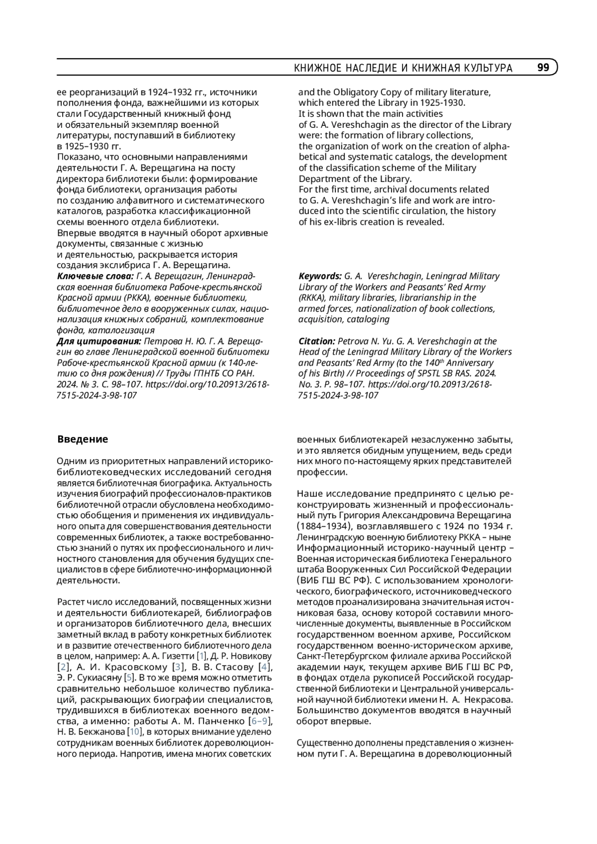 В результате анализа широкой источниковой базы установлены неизвестные ранее факты жизни Г. А. Верещагина, относящиеся к его учебе, военной службе, деятельности на посту руководителя Ленинградской военной библиотеки РККА, раскрыты некоторые аспекты истории возглавляемой им библиотеки: сроки и порядок проведения ее реорганизаций в 1924–1932 гг., источники пополнения фонда, важнейшими из которых стали Государственный книжный фонд и обязательный экземпляр военной литературы, поступавший в библиотеку в 1925–1930 гг.