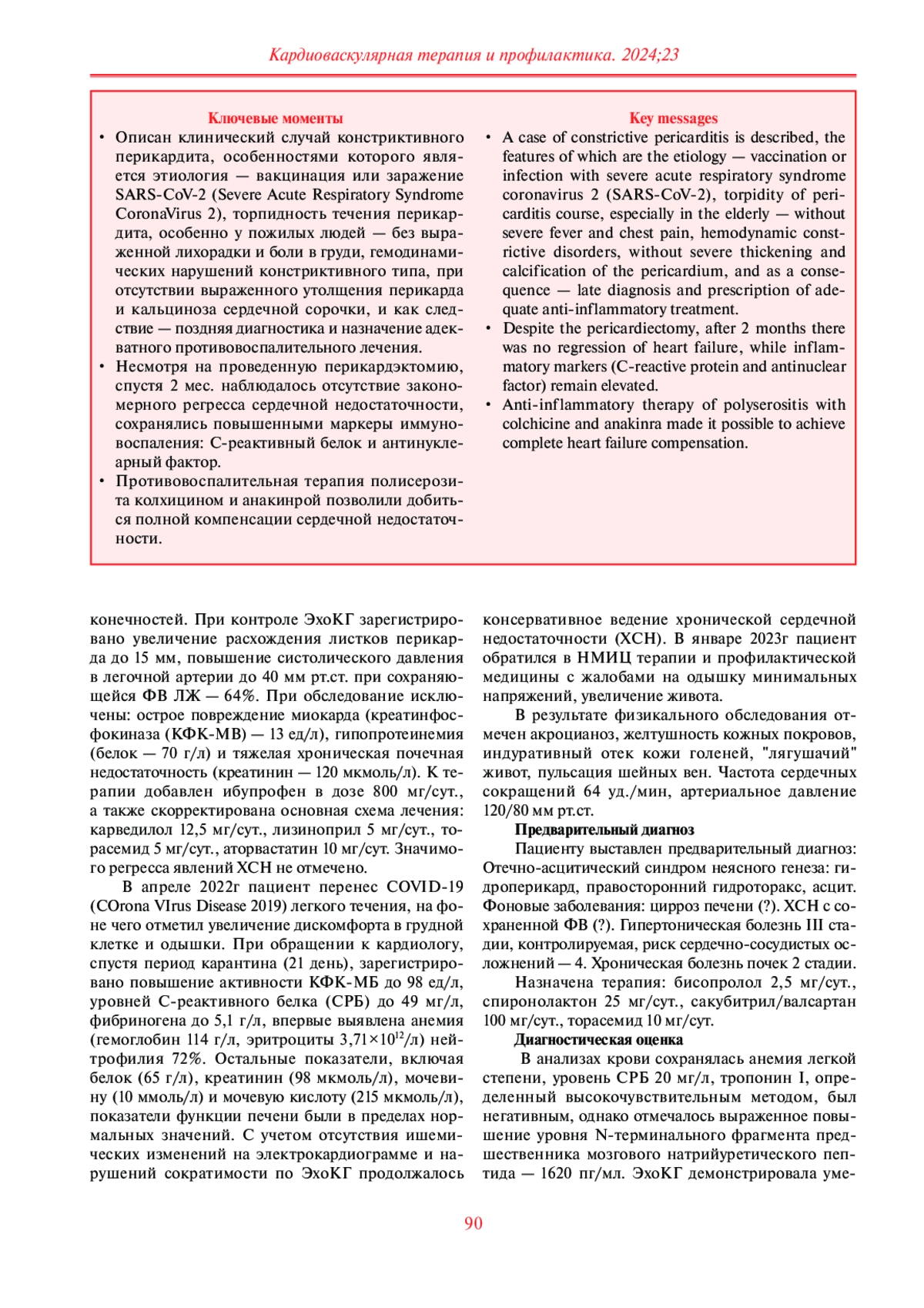 Представлен клинический случай пациента 70 лет, у которого экссудативно-констриктивный перикардит дебютировал с момента вакцинации от SARS-CoV-2 (Severe Acute Respiratory Syndrome CoronaVirus 2), и в течение полугода прогрессировал в виде нарастания отечно-асцитического синдрома, рефрактерного к терапии. Через год, после перенесенного COVID-19 (COrona VIrus Disease 2019), отмечались признаки нарастания сердечной недостаточности, сопровождающиеся повышением уровня провоспалительных маркеров, индикаторов повреждения сердечной мышцы. Диагноз экссудативно-констриктивного перикардита выставлен еще через 9 мес. на стадии анасарки. Трудности диагностики заключались в том, что перикард оставался неутолщенным по данным радиологических методов, имелись расхождения в данных мультиспиральной компьютерной томографии (МСКТ) и эхокардиографии. Проведена декортикация сердца, однако в течение 2 мес. после операции не было достигнуто значимого регресса отечно-асцитического синдрома (ОАС), сохранялось повышение уровней маркеров воспаления, что было расценено как полисерозит. Было решено назначить противовоспалительную терапию анакинрой и колхицином с успешным разрешением ОАС в течение 2 мес. Генно-инженерный препарат был постепенно отменен, прием колхицина продолжен до года. При контрольных обследованиях через 6, 12, 18 мес. обострений не наблюдалось, функциональный класс сердечной недостаточности сохраняется на уровне NYHA (New York Heart Association) 1. Пациент получает минимальную терапию в виде: эплеренон 25 мг, торасемид 5 мг и аторвастатин 20 мг.