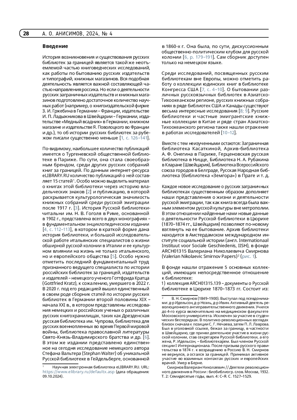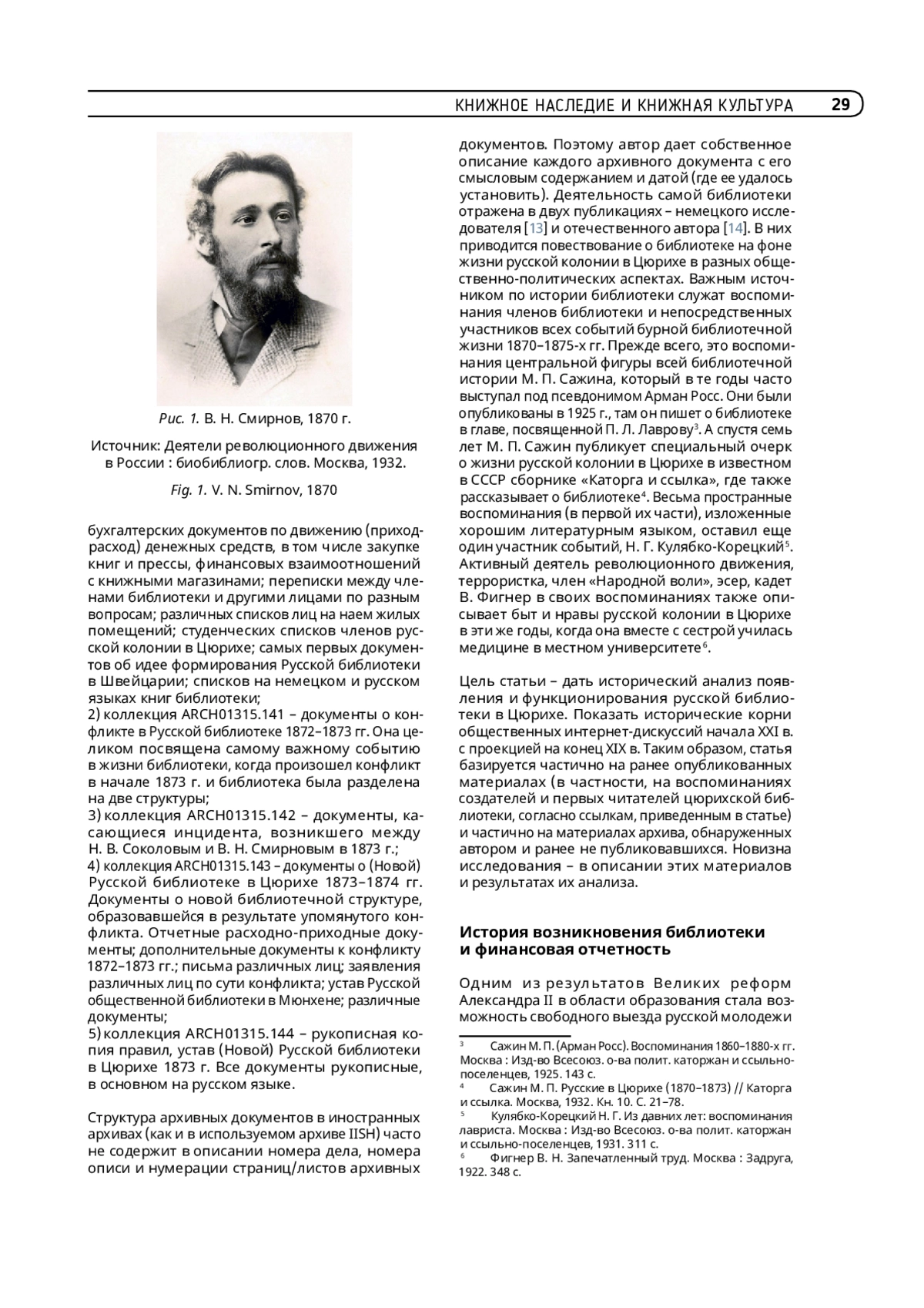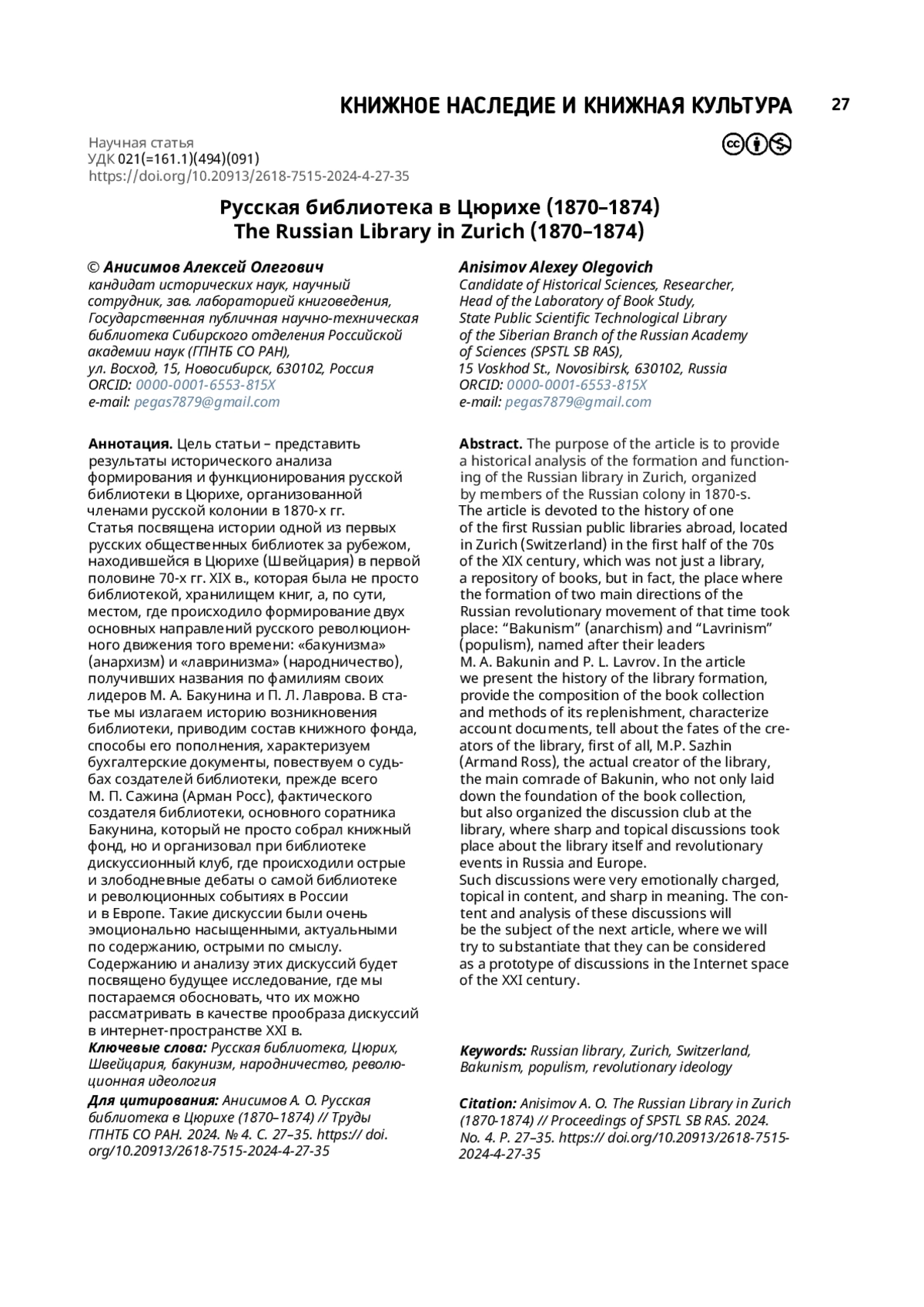 Цель статьи – представить результаты исторического анализа формирования и функционирования русской библиотеки в Цюрихе, организованной членами русской колонии в 1870 г., а также показать, что общественные дискуссии, происходившие в конце XIX в., по своему стилю очень напоминают современные интернет-дискуссии и, следовательно, могут рассматриваться как прообраз последних. Статья посвящена истории одной из первых русских общественных библиотек за рубежом, находившейся в Цюрихе (Швейцария) в первой половине 70-х гг. XIX в., которая была не просто библиотекой, хранилищем книг, а по сути, местом, где происходило формирование двух основных направлений русского революционного движения того времени: «бакунизма» (анархизм) и «лавринизма» (народничество), получивших названия по фамилиям своих лидеров М. А. Бакунина и П. Л. Лаврова. В первой части статьи излагается история возникновения библиотеки, приводится состав книжного фонда, обсуждаются способы его пополнения, характеризуются бухгалтерские документы, повествуется о судьбах создателей библиотеки, прежде всего, М. П. Сажина (Арман Росс), фактического создателя библиотеки, основного соратника Бакунина, который не просто собрал книжный фонд, но и организовал при библиотеке дискуссионный клуб, где происходили острые и злободневные дискуссии о самой библиотеке и о революционных событиях в России и в Европе. Такие дискуссии были очень эмоционально насыщенными, актуальными по содержанию, острыми по смыслу. Содержанию и анализу этих дискуссий будет посвящена вторая часть статьи, где будет показано и обосновано, что их можно рассматривать в качестве прообраза дискуссий в интернет-пространстве XXI в.