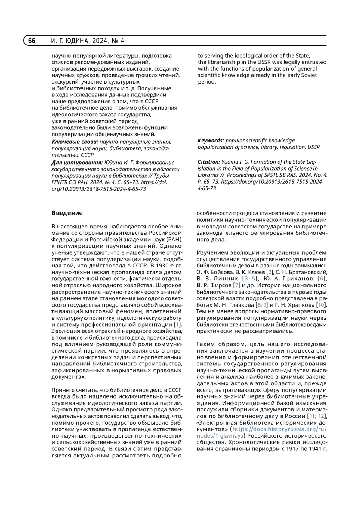 В настоящее время проблема истории развития государственного регулирования популяризации науки вызывает интерес у многих ученых. Однако особенности зарождения и формирования отечественной системы законодательства в сфере продвижения научно-популярных знаний через библиотеки изучены недостаточно. Цель исследования – выявление и анализ наиболее значимых правовых документов в области научно-технической пропаганды, в том числе адресованных библиотекам. Источниковой базой послужил массив нормативной документации с 1917 по 1941 г. В результате анализа автор определил, что становление и формирование отечественной системы государственного регулирования популяризации науки началось с первых лет существования советского государства. Распространение научных знаний в общество через систему неформального образования рассматривалось как необходимое средство пробуждения активности народных масс в процессе их участия в культурной революции, а также восстановлении и строительстве народного и сельского хозяйства. Нормативные правовые акты, касающиеся библиотек, разрабатывались в соответствии с внутренней политикой партии и правительства. Законодательная власть обязала библиотеки участвовать в пропаганде естественно-научных, производственно-технических и сельскохозяйственных знаний, а также содействовать развитию самообразования всех граждан страны. В официальных документах заданного периода зафиксированы конкретные формы и методы популяризации науки, в их числе: комплектование фондов научно-популярной литературы, подготовка списков рекомендованных изданий, организация передвижных выставок, создание научных кружков, проведение громких чтений, экскурсий, участие в культурных и библиотечных походах и т. д. Полученные в ходе исследования данные подтвердили наше предположение о том, что в СССР на библиотечное дело, помимо обслуживания идеологического заказа государства, уже в ранний советский период законодательно были возложены функции популяризации общенаучных знаний.