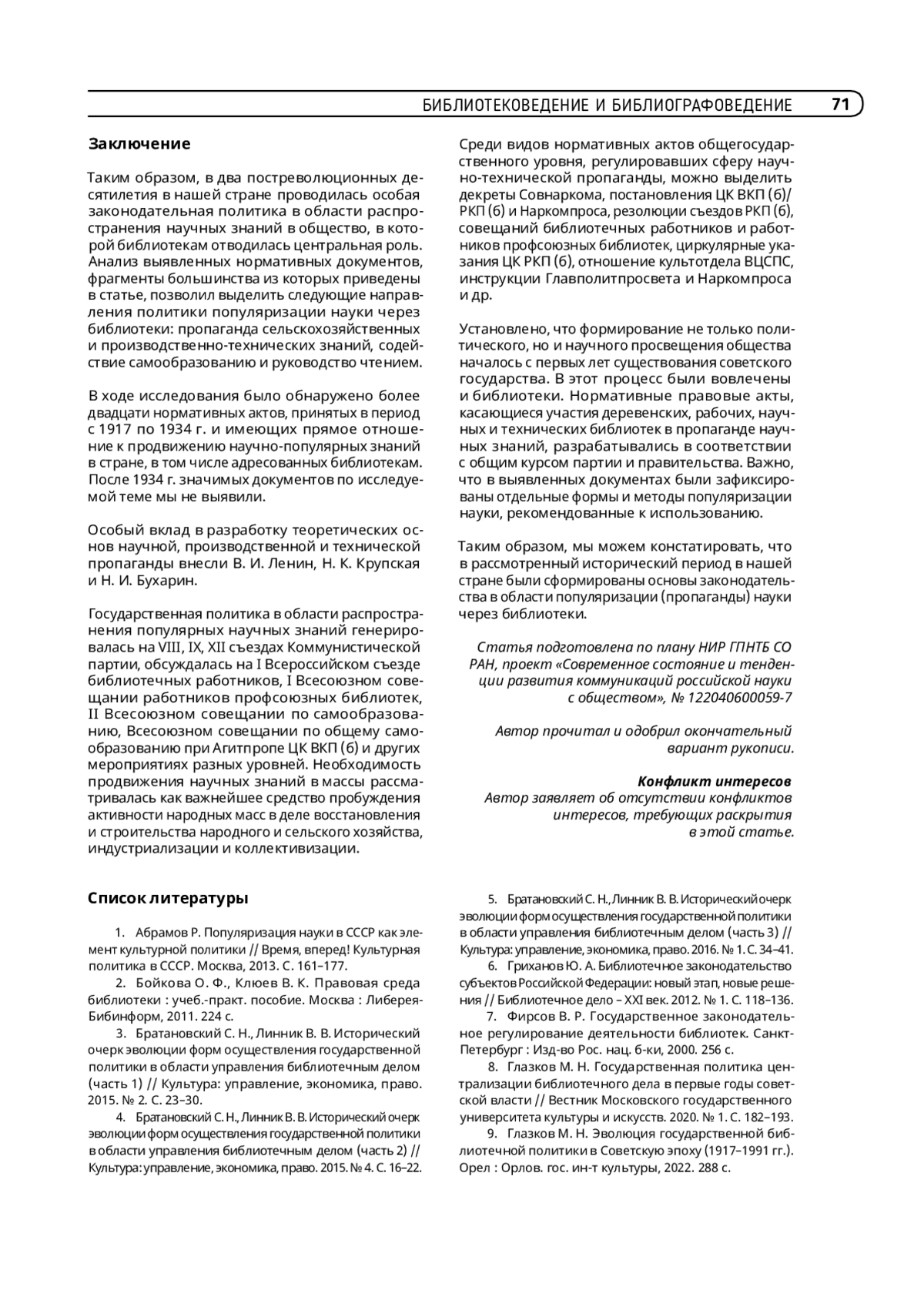 5. Братановский С. Н., Линник В. В. Исторический очерк эволюции форм осуществления государственной политики в области управления библиотечным делом (часть 3) // Культура: управление, экономика, право. 2016. № 1. С. 34-41.