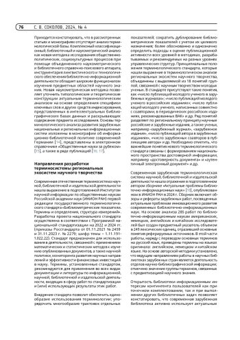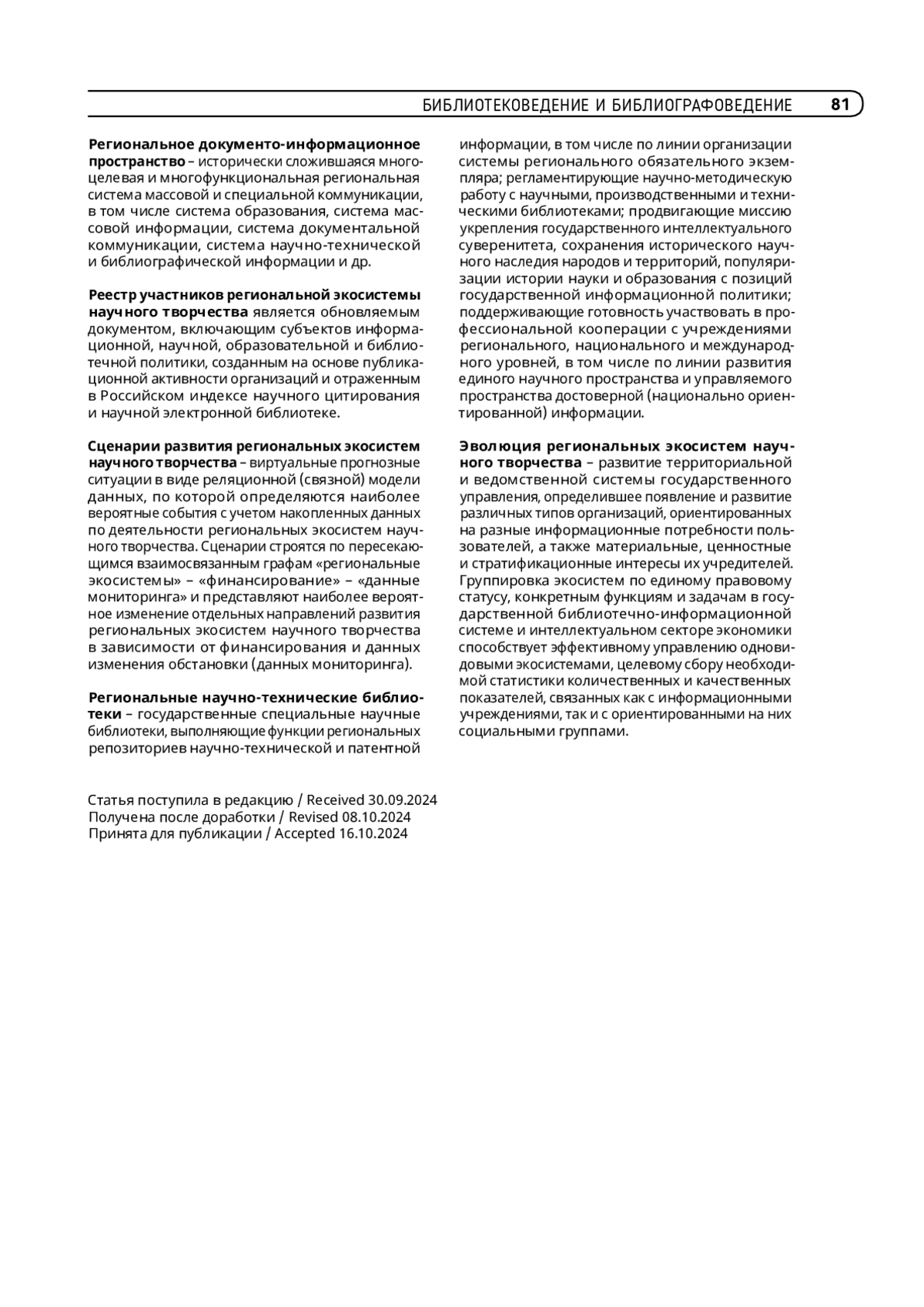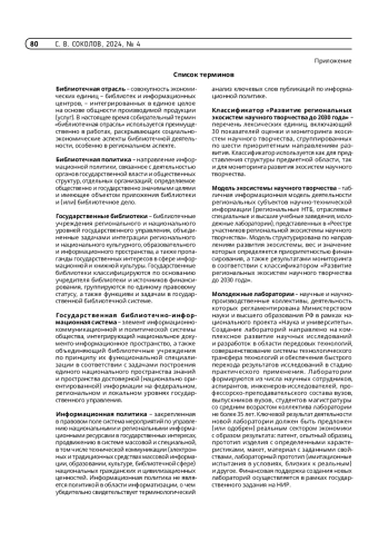 Цель статьи – разработка подходов к созданию понятийного аппарата для определения условий и направлений развития экосистем научного творчества в условиях развития коллаборации между научным, библиотечным, образовательным и издательским секторами экономики. В статье раскрыта методика терминологического подхода, показана важность его сочетания с наукометрическим анализом. Представлены работы научно-исследовательского отдела библиотековедения Института научной информации по общественным наукам Российской академии наук (ИНИОН РАН) в области создания понятийного аппарата региональных экосистем научного творчества по таким направлениям, как разработка государственных стандартов и публикация реферативных и информационно-аналитических материалов. Показано значение терминологического стандарта «Библиометрические показатели. Термины и определения, структура измерений», первая редакция которого подготовлена в соответствии с планом национальной стандартизации на 2024 год. Представлены основания для создания стандарта, основные цели и задачи его разработки, дана характеристика объекта стандартизации, показана область применения стандарта и его технико-экономическая эффективность. Отмечены термины, связанные с библиометрической оценкой деятельности молодых, в том числе зарубежных исследователей и созданием системы достоверной информации. Показано значение сборника ИНИОН РАН «Актуальные проблемы библиотечно-информационных наук» (2024) в исследовании современной зарубежной терминосистемы научной, библиотечной и издательской деятельности. Обращено внимание на наличие предметного указателя к сборнику объемом в 249 лексических единиц на основе анализа 285 работ по библиотечно-информационным наукам американских, немецких, английских и китайских исследователей. Отмечен потенциал Молодежной лаборатории при Институте научно-технической информации (ИНТИ) Донецкой Народной Республики для разработки концепции формирования региональных экосистем развития научного творчества. Наряду с исследованием понятийного аппарата экосистемы научного творчества на основании терминологического подхода представлена программа дальнейшего мониторинга и анализа экосистем научного творчества, а также список терминов.