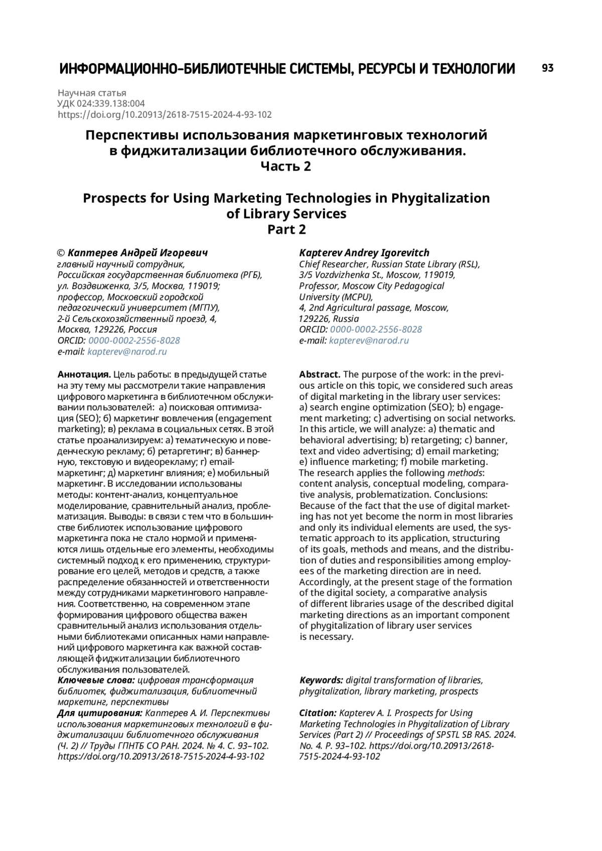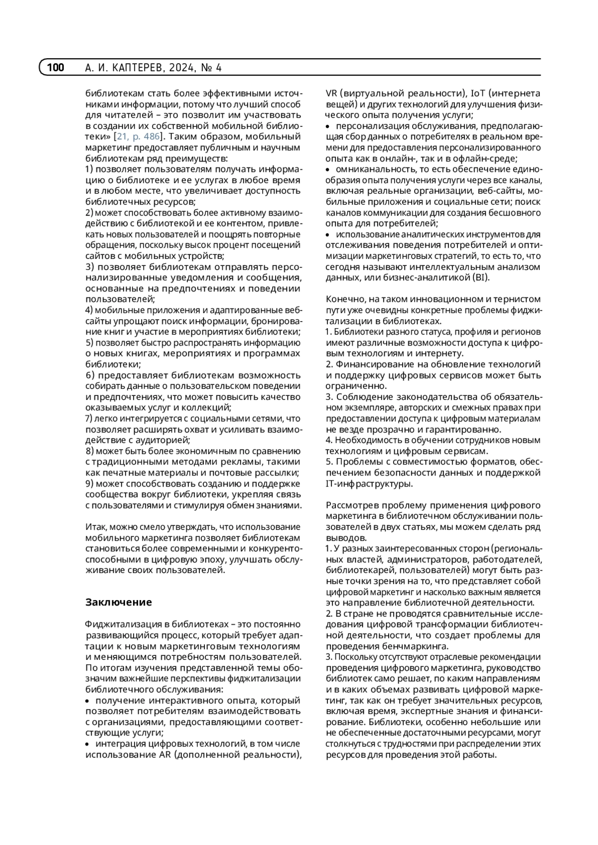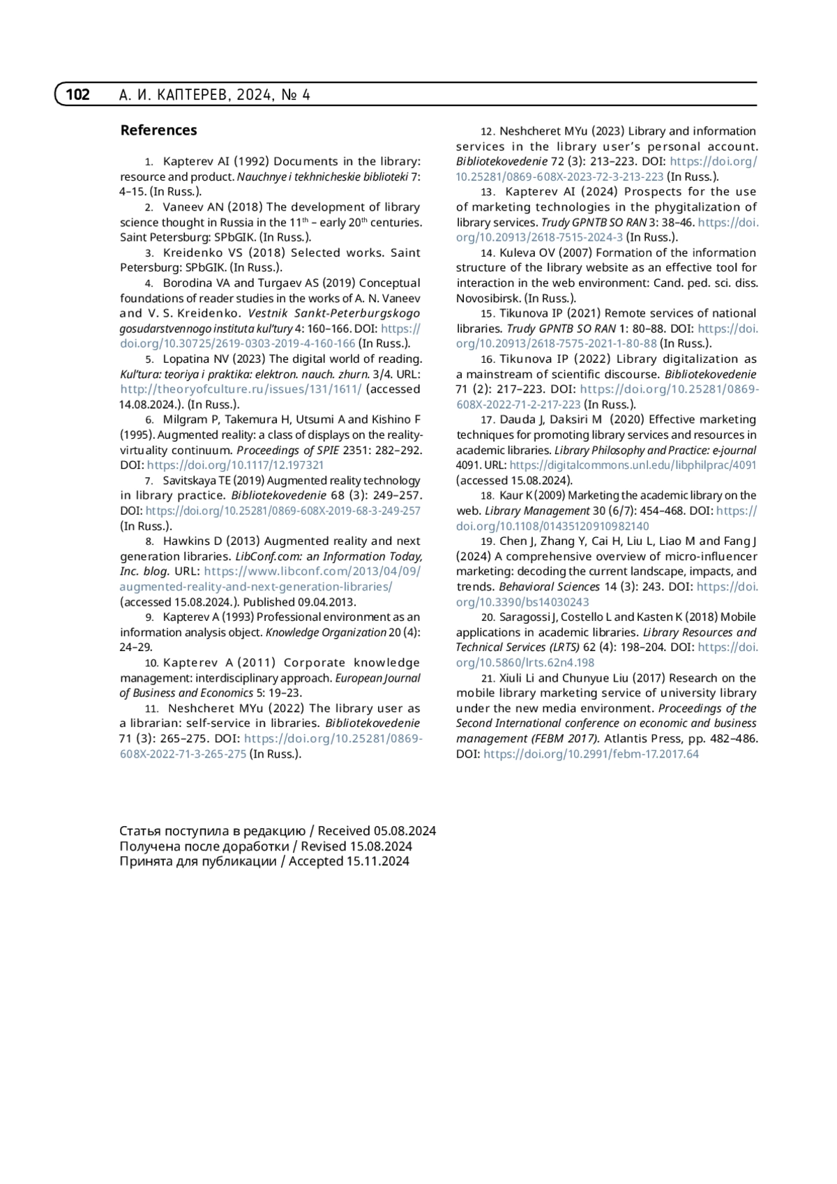 13. Каптерев А. И. Перспективы использования маркетинговых технологий в фиджитализации библиотечного обслуживания // Труды ГПНТБ СО РАН. 2024. № 3. С. 38-46. https://doi.org/10.20913/2618-7515-2024-3-38-46.