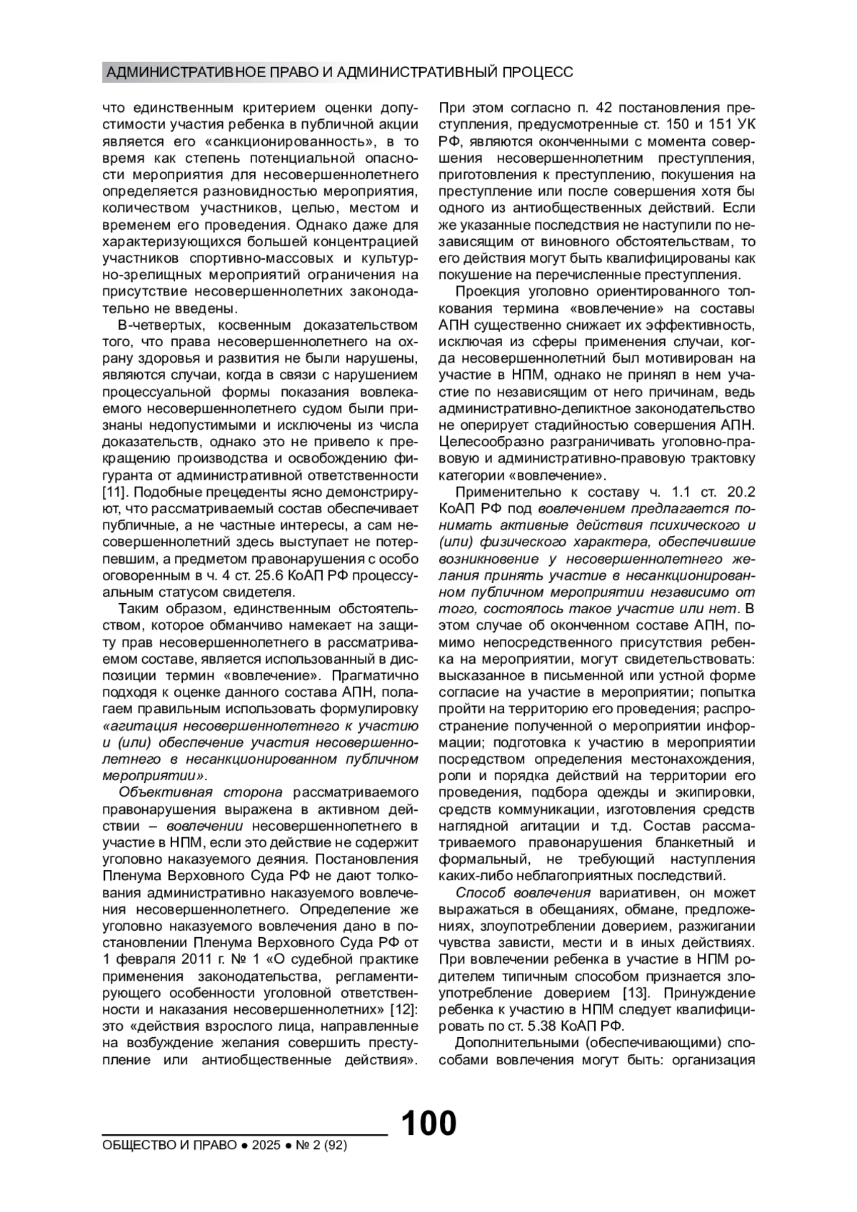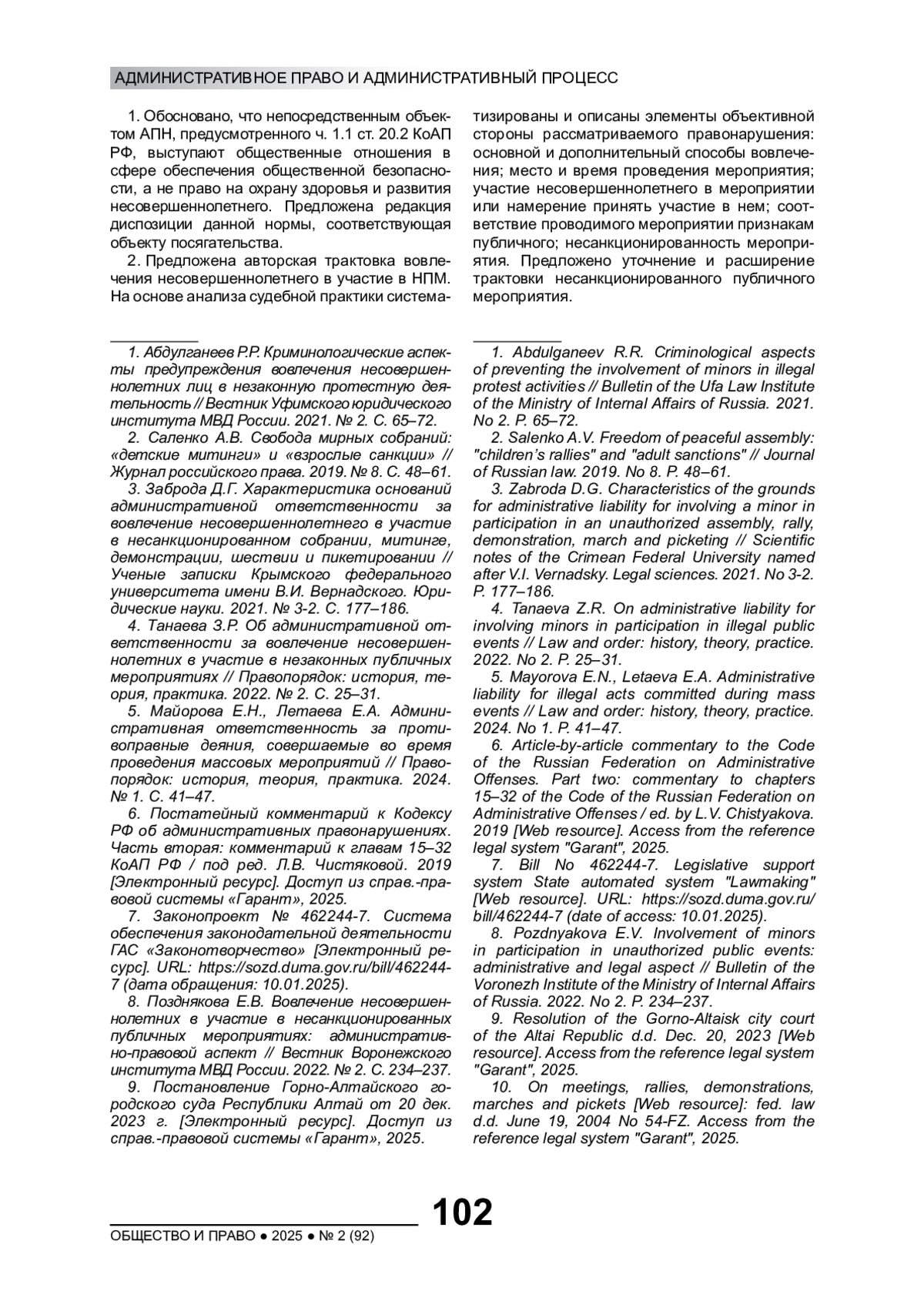 8. Позднякова Е.В. Вовлечение несовершеннолетних в участие в несанкционированных публичных мероприятиях: административно-правовой аспект // Вестник Воронежского института МВД России. 2022. № 2. С. 234-237. EDN: MROUGP