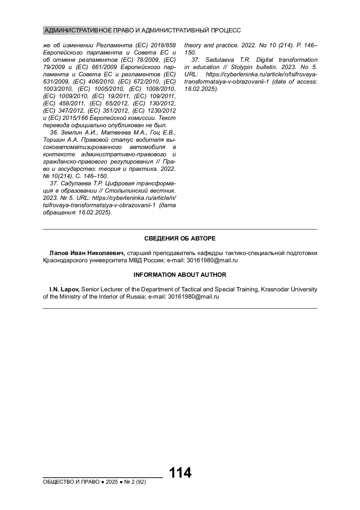 36. Землин А.И., Матвеева М.А., Гоц Е.В., Торшин А.А. Правовой статус водителя высокоавтоматизированного автомобиля в контексте административно-правового и гражданско-правового регулирования // Право и государство: теория и практика. 2022. № 10(214). С. 146-150.