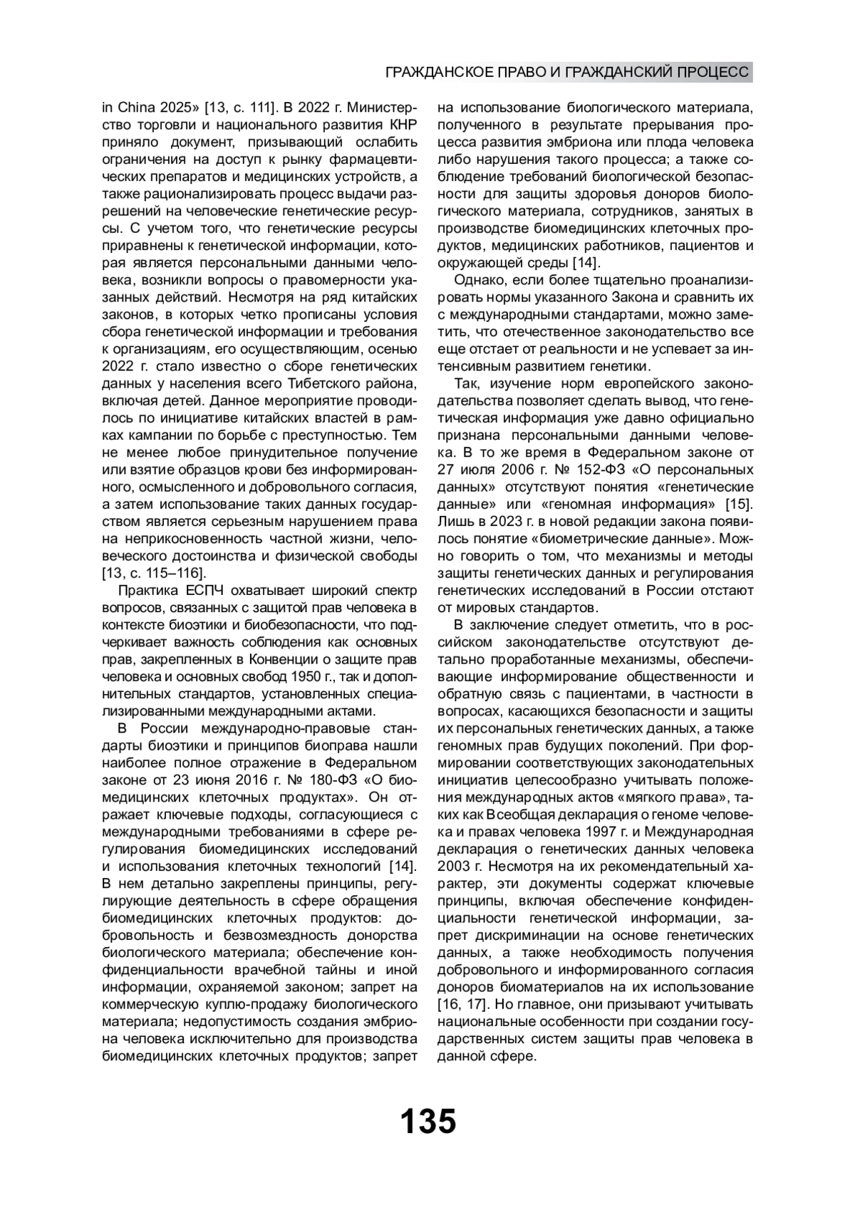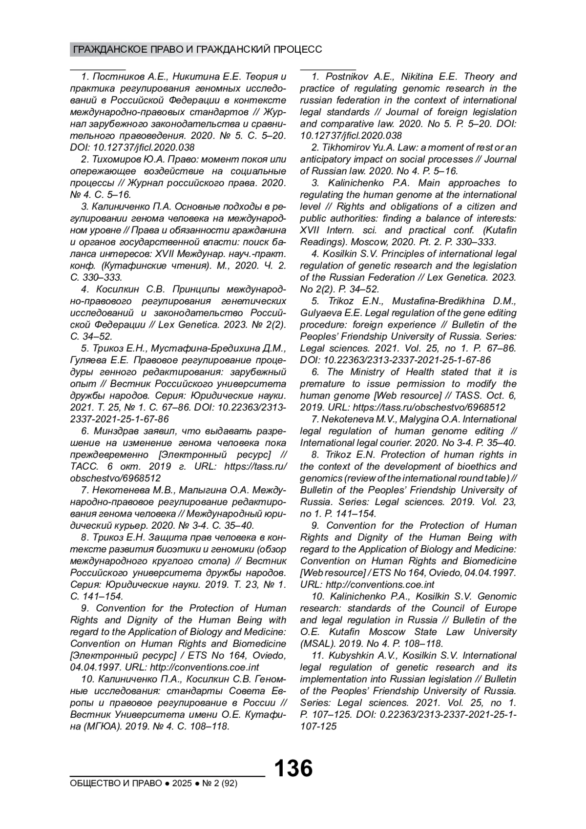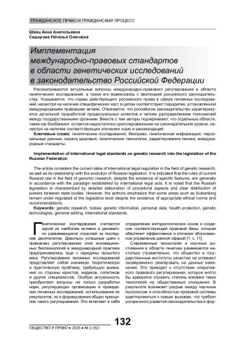 Статья: ИМПЛЕМЕНТАЦИЯ МЕЖДУНАРОДНО-ПРАВОВЫХ СТАНДАРТОВ В ОБЛАСТИ ГЕНЕТИЧЕСКИХ ИССЛЕДОВАНИЙ В ЗАКОНОДАТЕЛЬСТВО РОССИЙСКОЙ ФЕДЕРАЦИИ (2025)