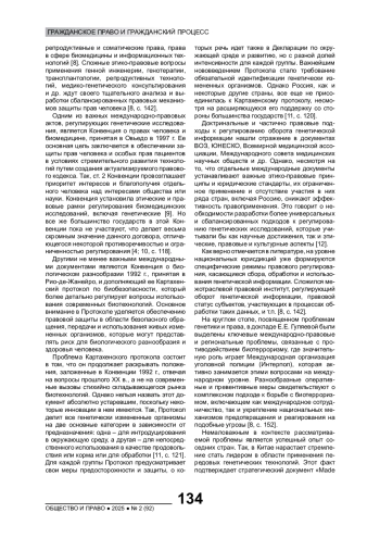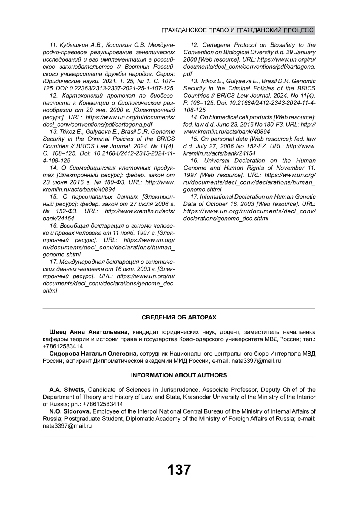 ШВЕЦ А. А., СИДОРОВА Н. О. ИМПЛЕМЕНТАЦИЯ МЕЖДУНАРОДНО-ПРАВОВЫХ СТАНДАРТОВ В ОБЛАСТИ ГЕНЕТИЧЕСКИХ ИССЛЕДОВАНИЙ В ЗАКОНОДАТЕЛЬСТВО РОССИЙСКОЙ ФЕДЕРАЦИИ // ОБЩЕСТВО И ПРАВО. 2025. № 2 (92)