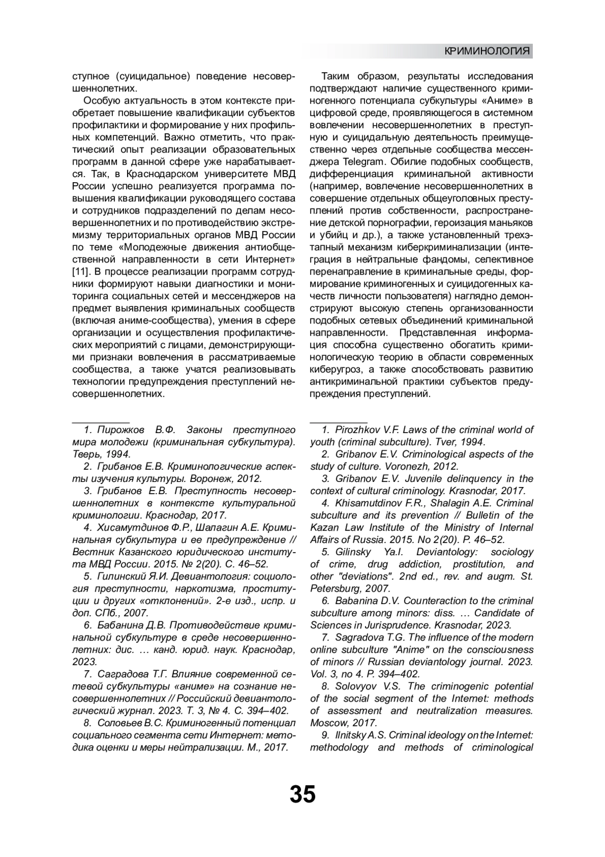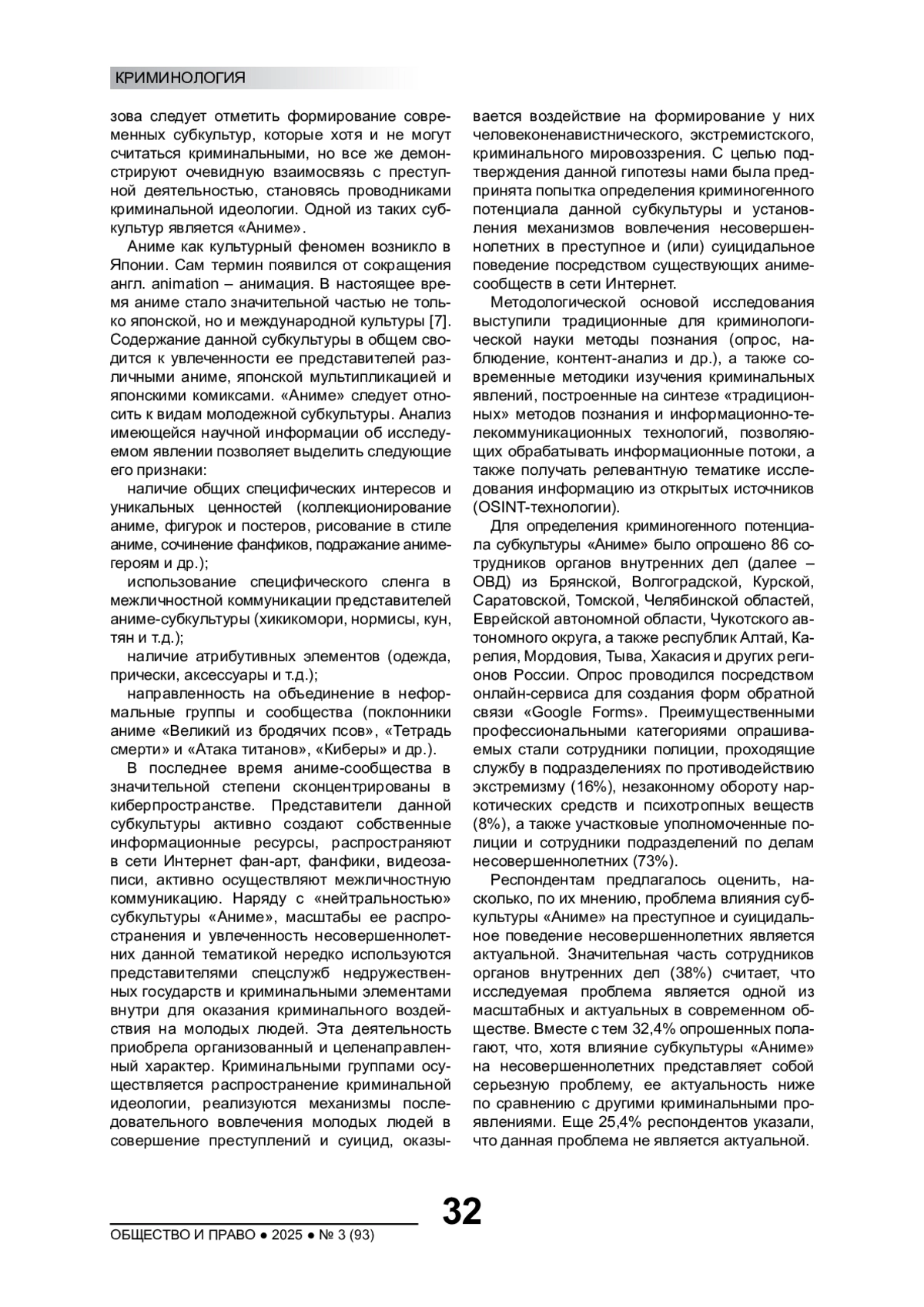 Статья: КРИМИНОГЕННЫЙ ПОТЕНЦИАЛ СУБКУЛЬТУРЫ «АНИМЕ» В СЕТИ ИНТЕРНЕТ И МЕХАНИЗМ ВОВЛЕЧЕНИЯ НЕСОВЕРШЕННОЛЕТНИХ В ПРЕСТУПНОЕ ИЛИ СУИЦИДАЛЬНОЕ ПОВЕДЕНИЕ (2025)