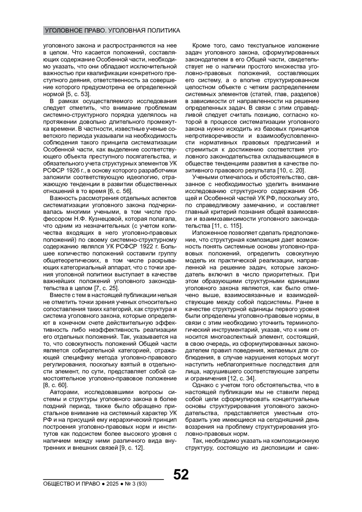 СИЗОВА В. Н. ВОПРОСЫ СТРУКТУРНОГО СТРОЕНИЯ РОССИЙСКОГО УГОЛОВНОГО ЗАКОНОДАТЕЛЬСТВА // ОБЩЕСТВО И ПРАВО. 2025. № 3 (93)