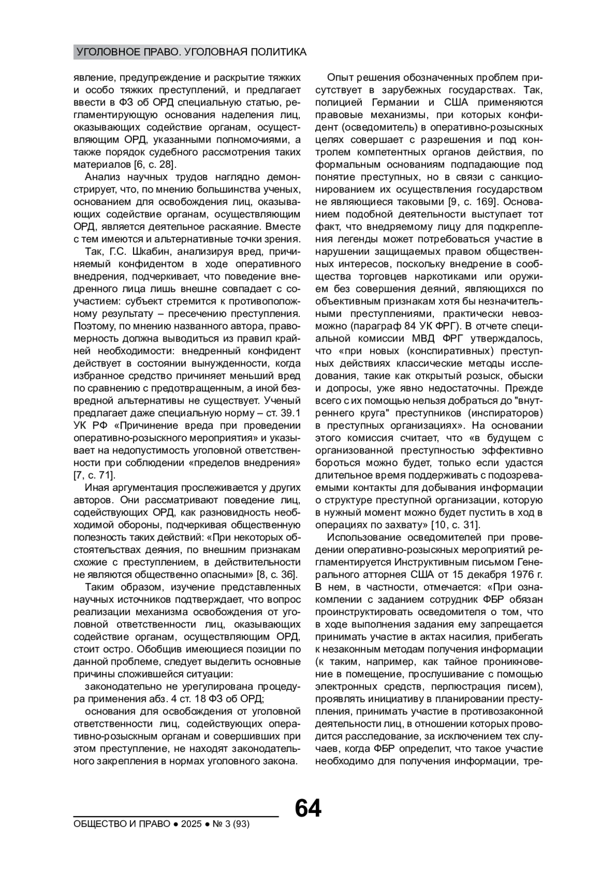 7. Шкабин Г.С. Уголовно-правовое обеспечение оперативно-разыскной деятельности: теоретико-прикладные и законодательные аспекты: дис. … д-ра юрид. наук. М., 2018. EDN: LYHENF