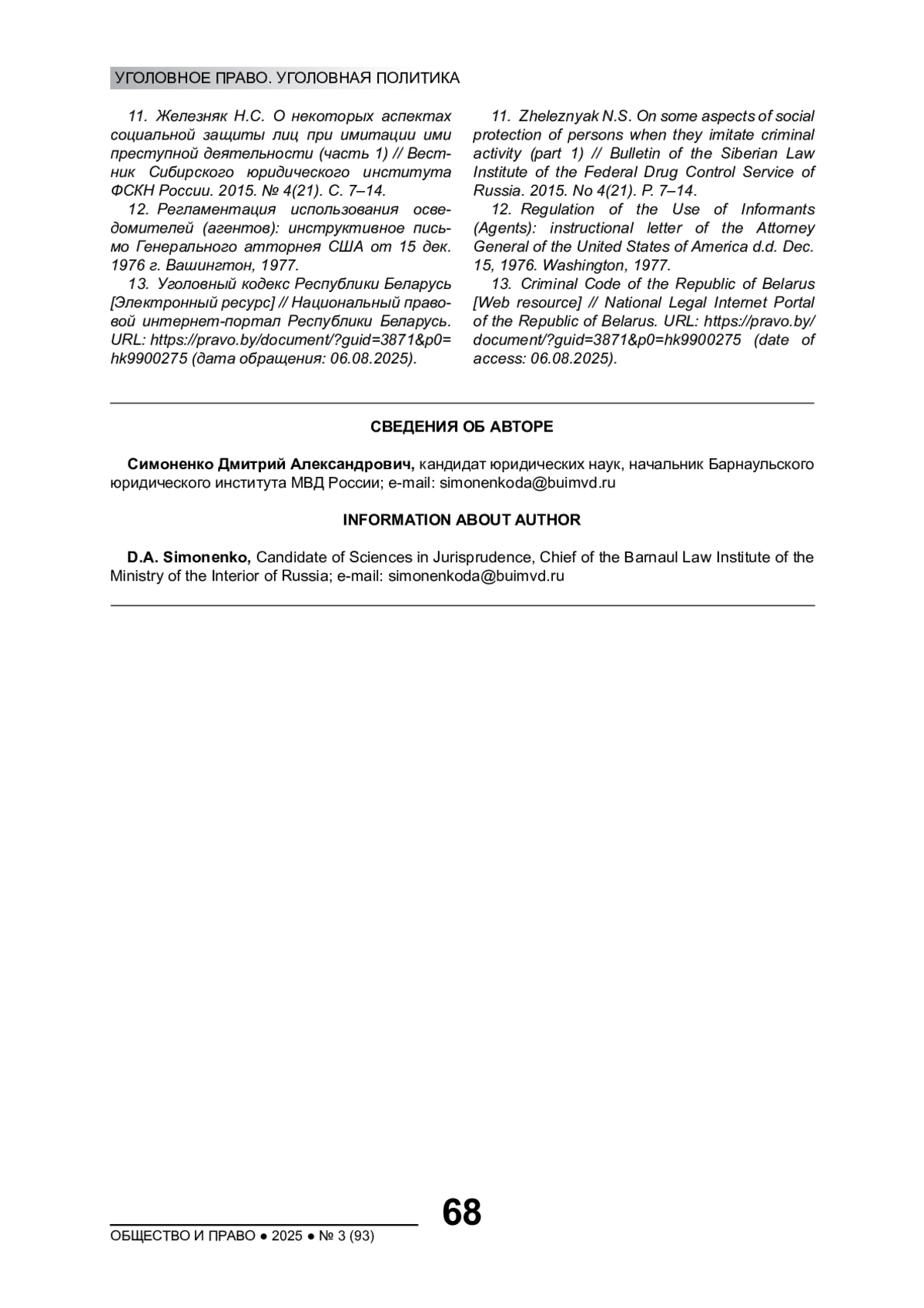 11. Железняк Н.С. О некоторых аспектах социальной защиты лиц при имитации ими преступной деятельности (часть 1) // Вестник Сибирского юридического института ФСКН России. 2015. № 4(21). С. 7-14.