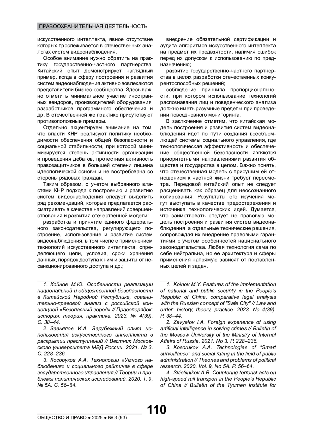 1. Койнов М.Ю. Особенности реализации национальной и общественной безопасности в Китайской Народной Республике, сравнительно-правовой анализ с российской концепцией “Безопасный город” // Правопорядок: история, теория, практика. 2023. № 4(39). С. 38-44. EDN: LEKMIE