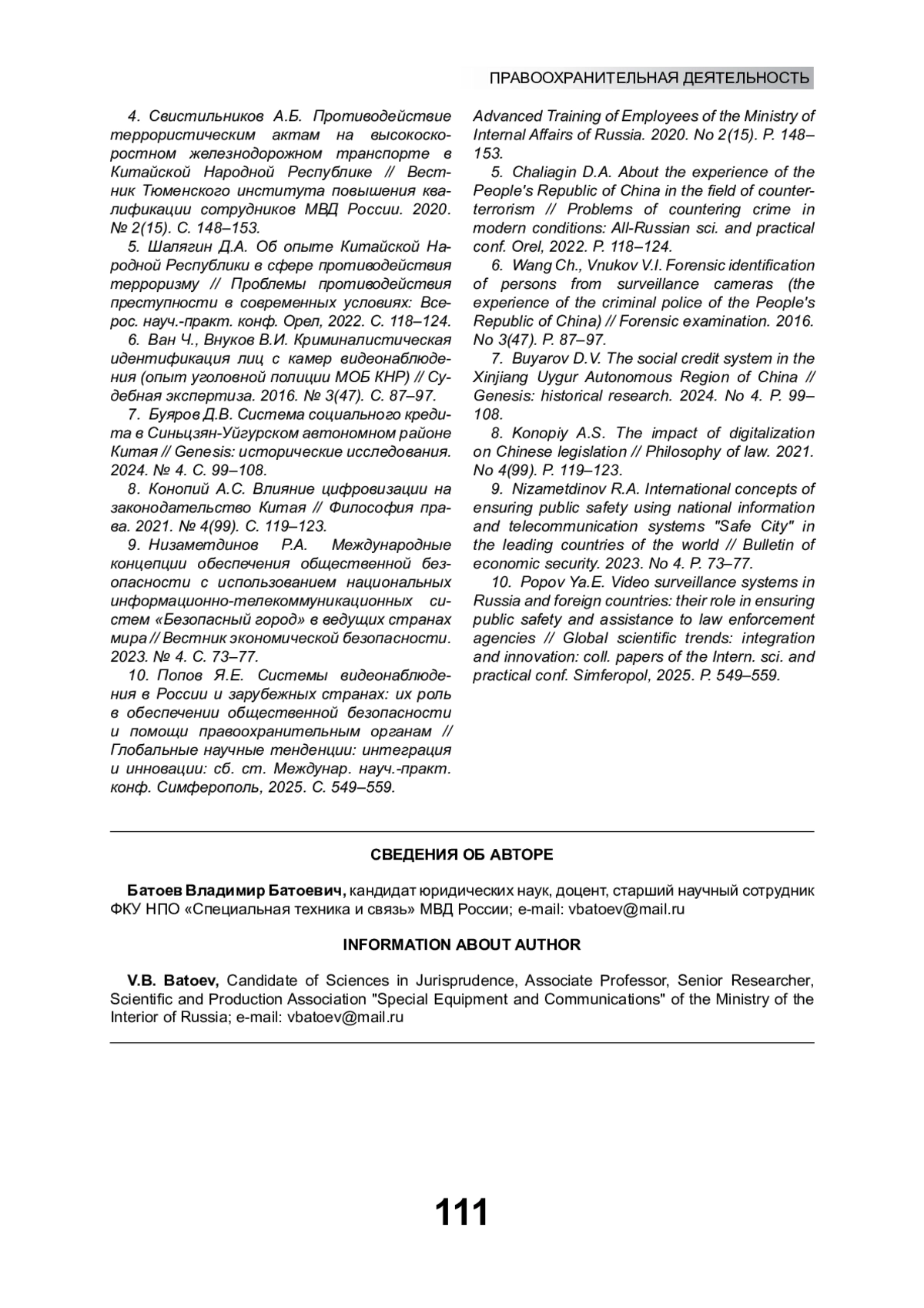 10. Попов Я.Е. Системы видеонаблюдения в России и зарубежных странах: их роль в обеспечении общественной безопасности и помощи правоохранительным органам // Глобальные научные тенденции: интеграция и инновации: сб. ст. Междунар. науч.-практ. конф. Симферополь, 2025. С. 549-559. EDN: VLBOHI