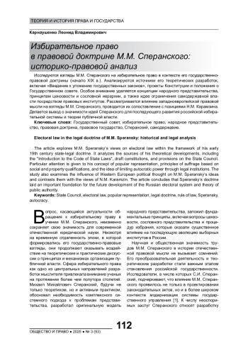 Исследуются взгляды М. М. Сперанского на избирательное право в контексте его государственноправовой доктрины (начало XIX в.). Анализируются источники его теоретических разработок, включая «Введение к уложению государственных законов», проекты Конституции и положения о Государственном совете. Особое внимание уделяется концепции народного представительства, принципам цензовости и сословной иерархии, а также идее ограничения самодержавной власти посредством правовых институтов. Рассматривается влияние западноевропейской правовой мысли на взгляды М. М. Сперанского, проводится их сопоставление с позициями Н. М. Карамзина. Делается вывод о значимости идей Сперанского для последующего развития российской избирательной системы и теории публичной власти