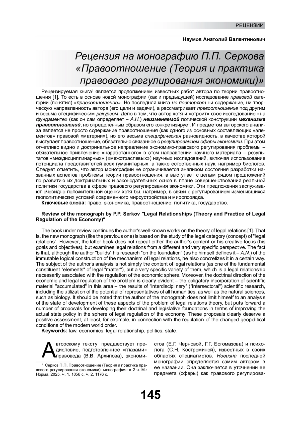 Рецензируемая книга1 является продолжением известных работ автора по теории правоотношения [1]. То есть в основе новой монографии (как и предыдущей) исследование правовой категории (понятия) «правоотношение». Но последняя книга не повторяет ни содержание, ни творческую направленность автора (его цели и задачи), а рассматривает правоотношение под другим и весьма специфическим ракурсом. Дело в том, что автор хотя и «строит» свое исследование «на фундаменте» (как он сам определяет – А. Н.) неизменяемой логической конструкции механизма правоотношений, но определенным образом его конкретизирует. И предметом авторского анализа является не просто содержание правоотношения (как одного из основных составляющих «элементов» правовой «материи»), но его весьма специфическая разновидность, в качестве которой выступает правоотношение, обязательно связанное с регулированием сферы экономики. При этом отчетливо видно и доктринальное направление экономико-правового регулирования проблемы – обязательное привлечение «наработанного» в этом направлении научного материала – результатов «междисциплинарных» («межотраслевых») научных исследований, включая использование потенциала представителей всех гуманитарных, а также естественных наук, например биологов. Следует отметить, что автор монографии не ограничивается анализом состояния разработки названных аспектов проблемы теории правоотношения, а выступает с целым рядом предложений по развитию их доктринальных и законодательных основ в плане совершенствования реальной политики государства в сфере правового регулирования экономики. Эти предложения заслуживают очевидно положительной оценки хотя бы, например, в связи с регулированием изменившихся геополитических условий современного мироустройства и миропорядка
