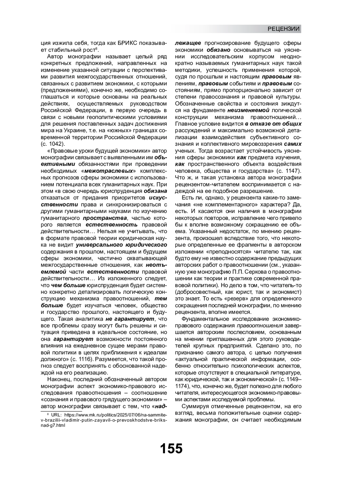 Авторскому тексту1 предшествует предисловие, подготовленное «глазами» правоведа (В. В. Архипова), экономиния экономики2. С учетом этого характеристику книги начнем с анализа мнения приглашенных, и именно экономистов («глазами экономистов»). Обратим внимание на категоричность их выводов относительно перспективы использования/неиспользования в доктринальном обороте юридической практики регулирования обсуждаемых проблем: «… Если условно исключить из сферы применения экономику, то юридическая наука и практика не погибнут, но экономика не выживет». Далее идут доказательства этого тезиса: «И в этой ситуации, когда сталкиваются объективно обусловленное и субъективно сознательное, и состоит основная сложность