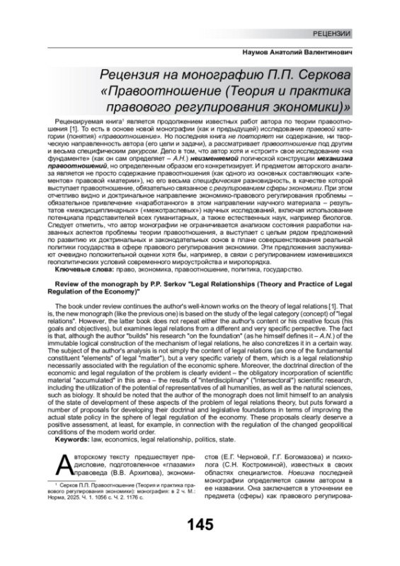 1. Рецензия А.В. Наумова на монографию П.П. Серкова “Правоотношение (Теория и практика современной правовой политики”): в 2 ч. Часть первая. “Правовая доктрина и меры правовой политики”. Часть вторая. “Обобщение юридических опытов восхождения к человеку, обществу и государству” // Вестник Университета прокуратуры Российской Федерации. 2022. № 6(92). С. 117-127. EDN: DBZXUK