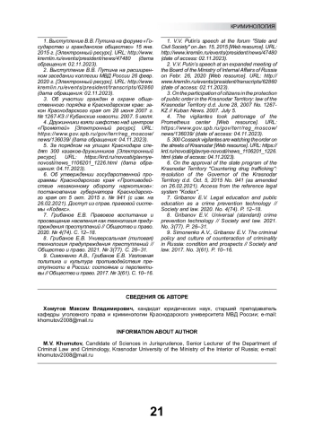 7. Грибанов Е.В. Правовое воспитание и просвещение населения как технология предупреждения преступлений // Общество и право. 2020. № 4(74). С. 12-18. EDN: PIUIKV