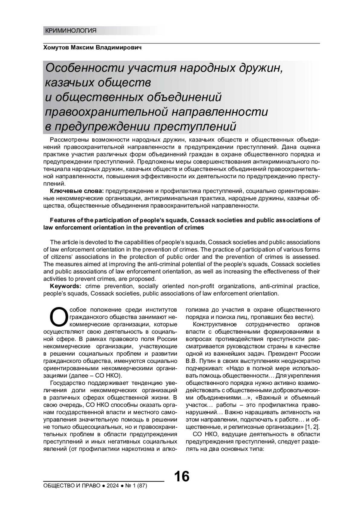 Рассмотрены возможности народных дружин, казачьих обществ и общественных объединений правоохранительной направленности в предупреждении преступлений. Дана оценка практике участия различных форм объединений граждан в охране общественного порядка и предупреждении преступлений. Предложены меры совершенствования антикриминального потенциала народных дружин, казачьих обществ и общественных объединений правоохранительной направленности, повышения эффективности их деятельности по предупреждению преступлений