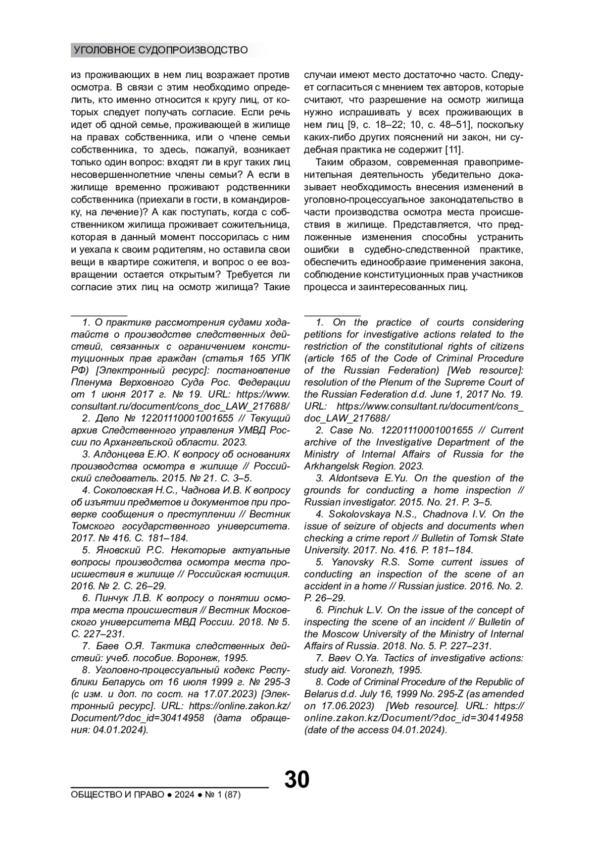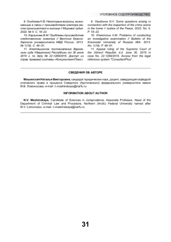 9. Осодоева Н.В. Некоторые вопросы, возникающие в связи с производством осмотра места происшествия в жилище // Мировой судья. 2022. № 5. С. 18-22. EDN: OMQHAE