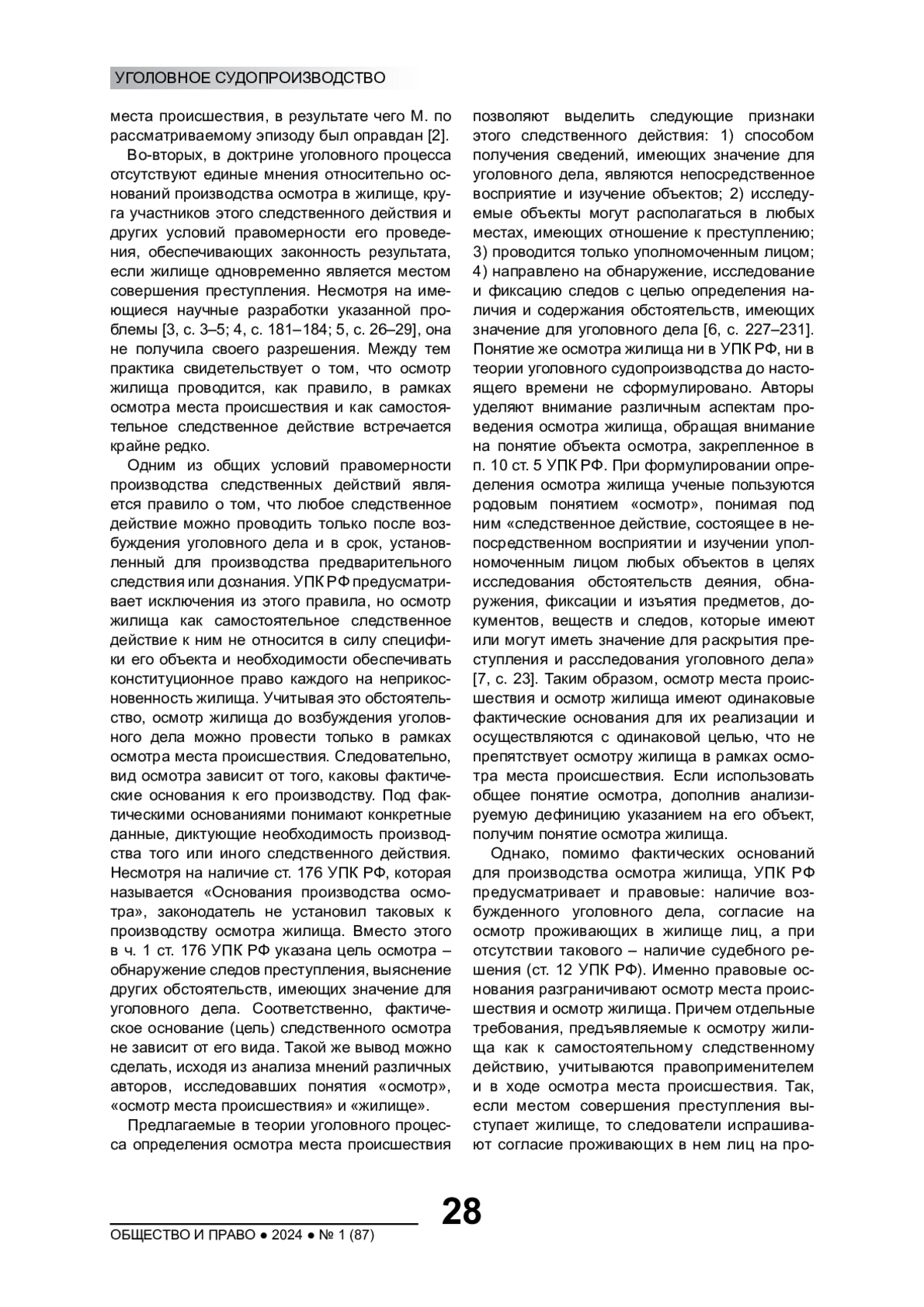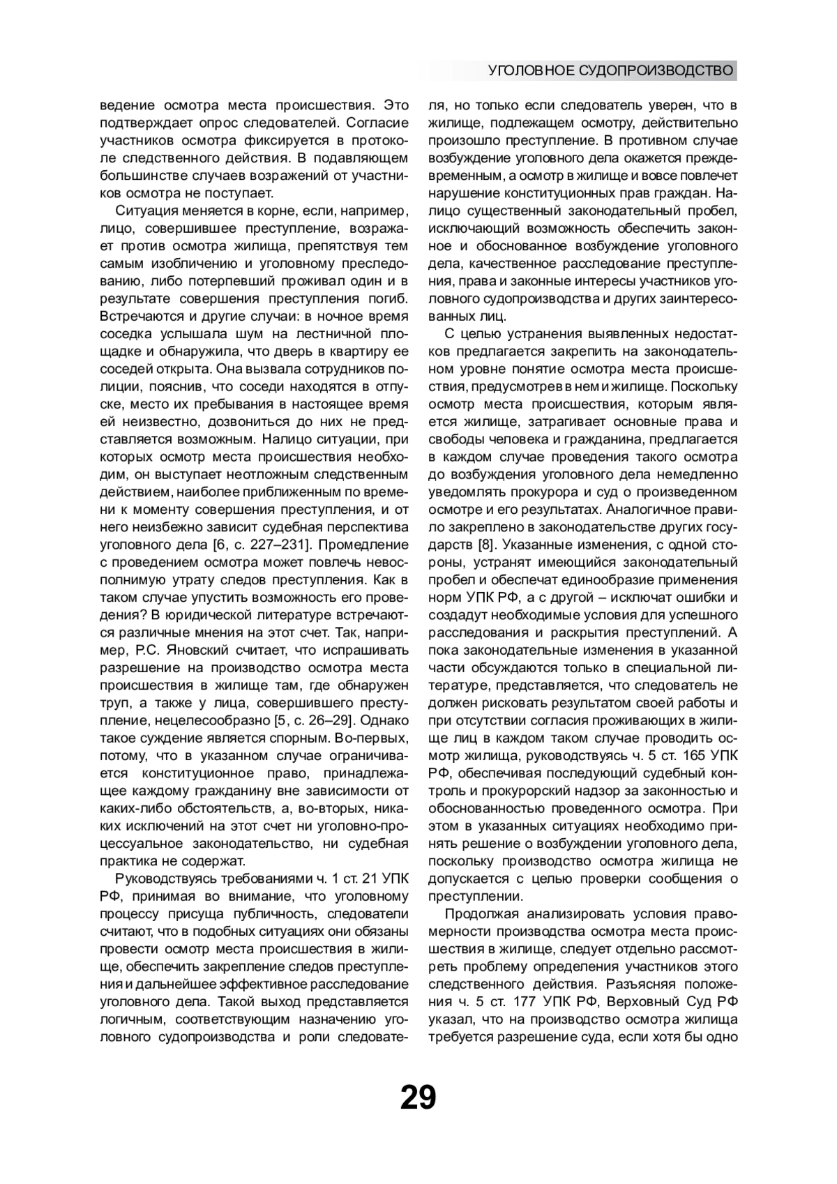 5. Яновский Р.С. Некоторые актуальные вопросы производства осмотра места происшествия в жилище // Российская юстиция. 2016. № 2. С. 26-29. EDN: WXITHZ