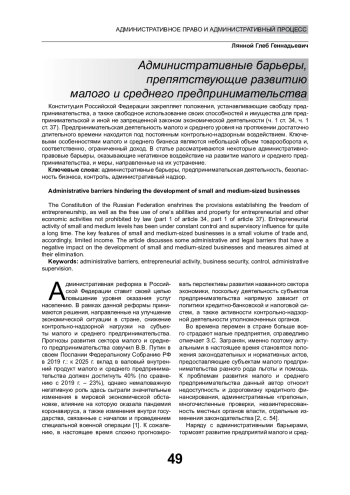 Конституция Российской Федерации закрепляет положения, устанавливающие свободу предпринимательства, а также свободное использование своих способностей и имущества для предпринимательской и иной не запрещенной законом экономической деятельности (ч. 1 ст. 34, ч. 1 ст. 37). Предпринимательская деятельность малого и среднего уровня на протяжении достаточно длительного времени находится под постоянным контрольно-надзорным воздействием. Ключевыми особенностями малого и среднего бизнеса являются небольшой объем товарооборота и, соответственно, ограниченный доход. В статье рассматриваются некоторые административноправовые барьеры, оказывающие негативное воздействие на развитие малого и среднего предпринимательства, и меры, направленные на их устранение