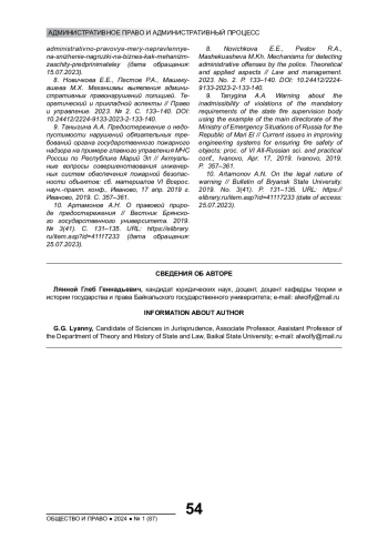 8. Новичкова Е.Е., Пестов Р.А., Машекуашева М.Х. Механизмы выявления административных правонарушений полицией. Теоретический и прикладной аспекты // Право и управление. 2023. № 2. С. 133-140. DOI: 10.24412/2224-9133-2023-2-133-140 EDN: ZILLQT