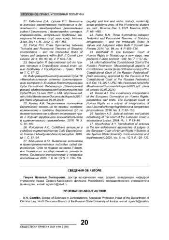 21. Кабалина Д.А., Гулиев Р.Л. Важность и значение эволютивного толкования в деятельности международных региональных судов // Законность и правопорядок: история, современность, актуальные проблемы: материалы VI межвуз. студ. науч. конф., Москва, 3 дек. 2021 г. М., 2022. С. 461-465. EDN: PPVBWT