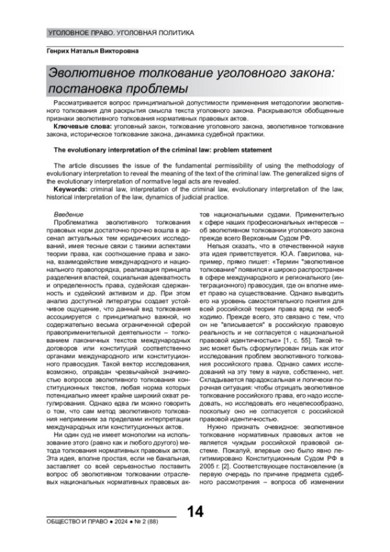 1. Гаврилова Ю.А. Об эволютивном толковании в российском праве // Legal Concept = Правовая парадигма. 2021. Т. 20, № 1. С. 50-55. EDN: NKQQLS