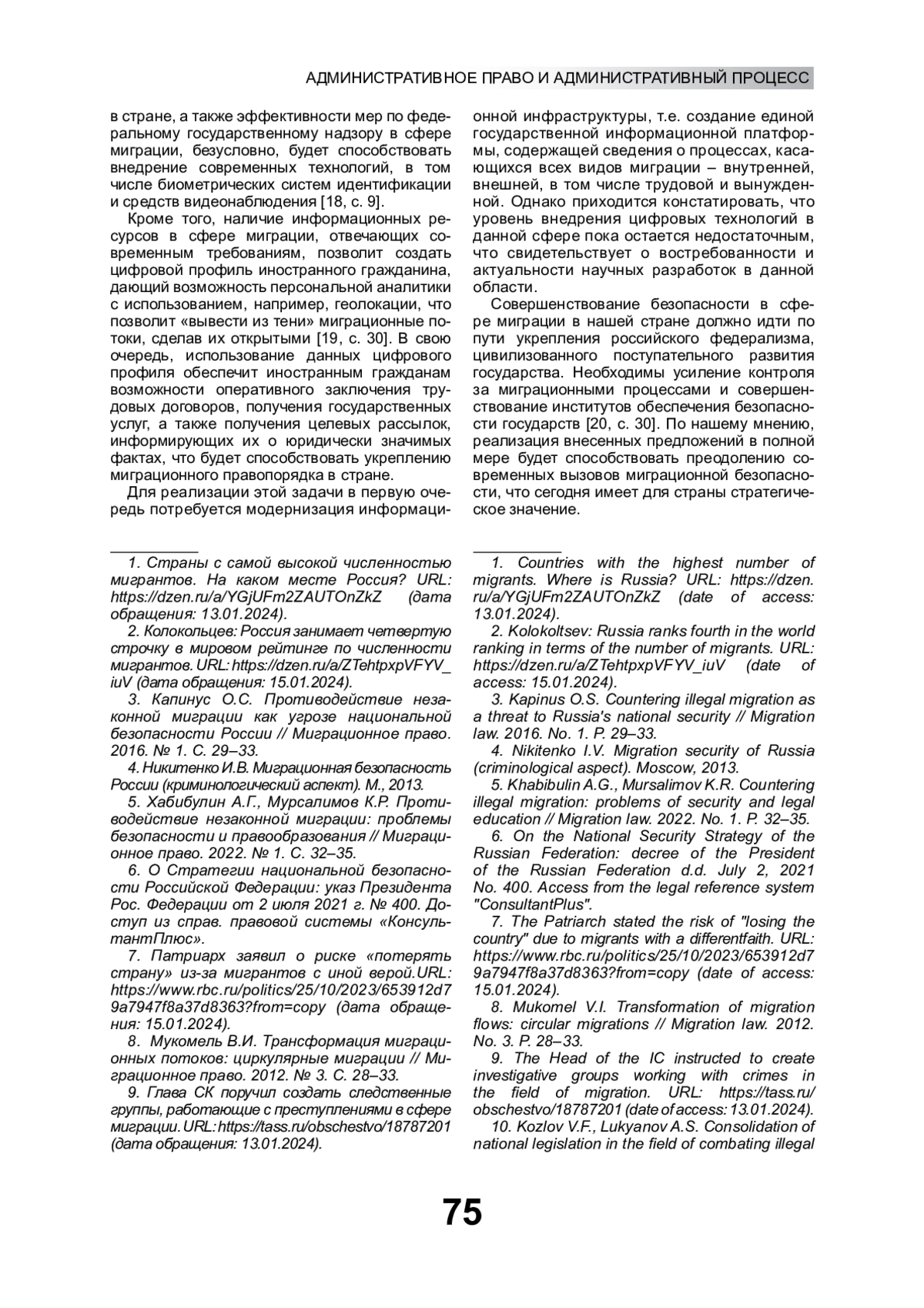 18. Жеребцов А.Н., Малышев Е.А. Миграционная безопасность России: вопросы профилактики незаконной миграции административно-правовыми средствами // Миграционное право. 2023. № 3. С. 8-10. EDN: IAQYEB