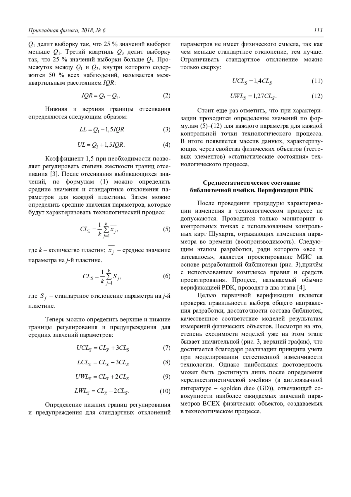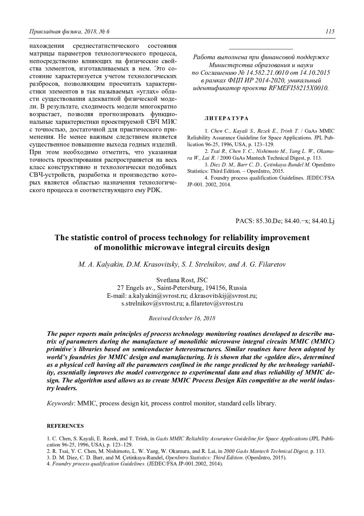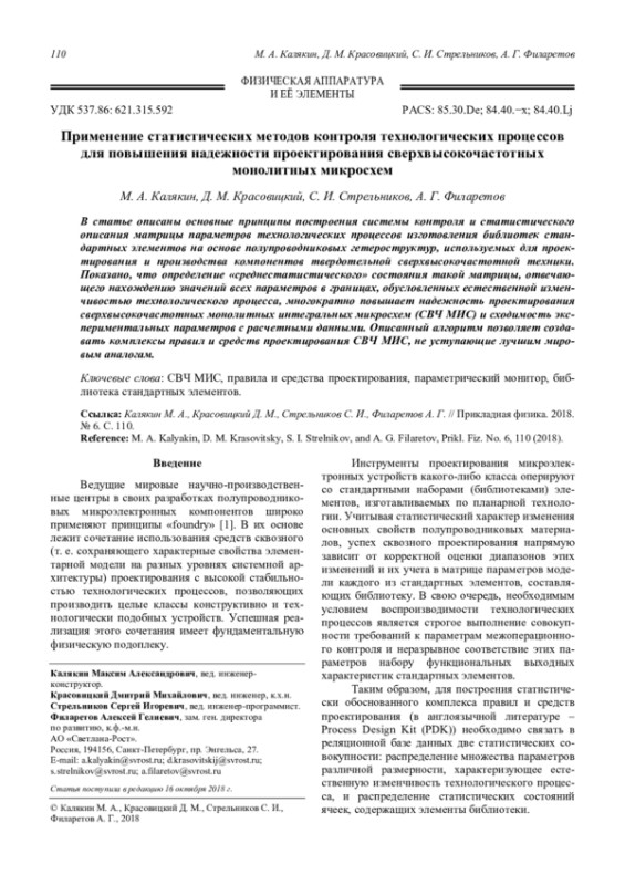Калякин М. А., Красовицкий Д. М., Стрельников С. И., Филаретов А. Г. Применение статистических методов контроля технологических процессов для повышения надежности проектирования сверхвысокочастотных монолитных микросхем 110