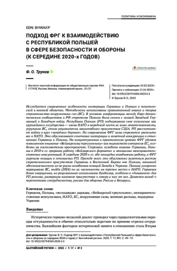 Исследуются современные особенности кооперации Германии и Польши в политической и военной областях. Методически использованы сравнительный анализ и теория строительства вооруженных сил (ВС). В условиях конфронтации между Евро-Атлантическим сообществом и РФ стратегия Польши была схожа с линией Западной Германией в Холодную войну. Республика Польша (РП) подчеркивала свое положение как крупнейшего государства — члена НАТО в передовой части ее зоны ответственности, укрупнила ВС, стала реципиентом масштабного присутствия США. РП рассчитывает войти в круг «западных держав». Но современная ФРГ сама стремится увеличить вес в НАТО. Это обусловливает сочетание кооперации и заметной конкуренции в отношениях Германии и Польши. На концептуальном и практическом уровнях ФРГ уделяла повышенное внимание «Веймарскому треугольнику» как выразителю интересов ЕС, особенно на постсоветском пространстве. Стремясь ослабить влияние Германии, Польша в 2010- е гг. прервала работу «Веймарского формата» и механизма межправительственных консультаций. К середине 2020-х гг. обе площадки возобновили работу, а ФРГ укрепила позиции в отношении РП. Прежде всего это обусловлено заметным ростом стратегического присутствия Германии в Восточной Европе вне Польши, взаимной обеспокоенностью из-за риска ослабления позиций Запада в Украине. Польша ускоренно наращивала ВС, выйдя (2024) по их численности на третье место в НАТО. Германия более инерционна, но рациональнее использовала бундесвер, особенно в «домашнем» для РП регионе, развернула наземное присутствие к северу и югу от нее. Делается вывод о перспективах сотрудничества, рисках для обороны России и Беларуси.