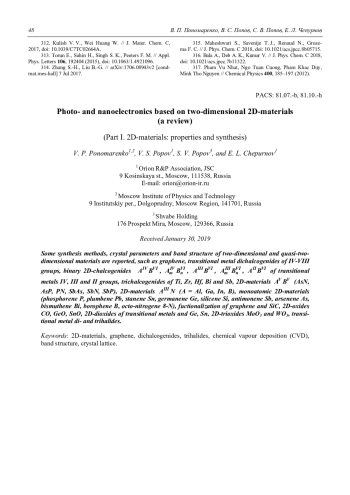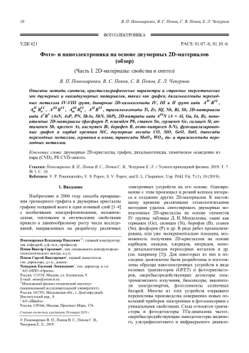 Несмотря на обнаруженные многообещающие свойства многих двумерных материалов, их широкое внедрение в нано- и фотоэлектронику требует поиска 2D-наноструктур, оптимальных с точки зрения оптических, фотоэлектрических и структурных свойств. В статье представлен обзор результатов теоретических и экспериментальных работ, опубликованных в последнее время по синтезу и изучению структурных и электронных свойств двумерных и квазидвумерных материалов с целью уточнения наиболее оптимальных способов и областей их применения в нано- и фотоэлектронике.